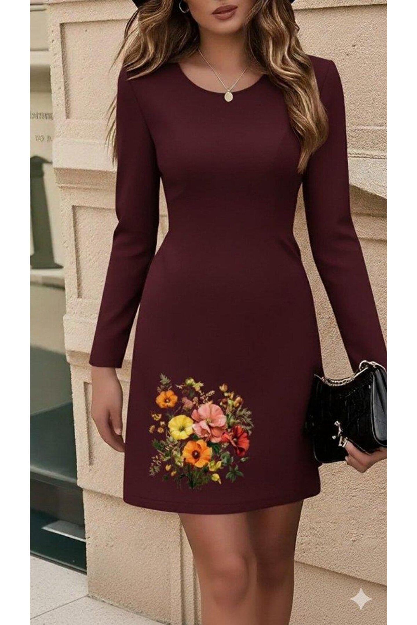 ARONA Kadın Uzun Kollu Bisiklet Yaka çiçek Desenli Mini Dalgıç Elbise
