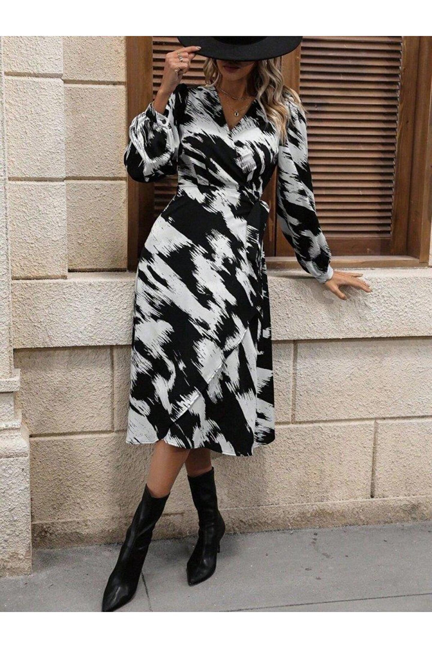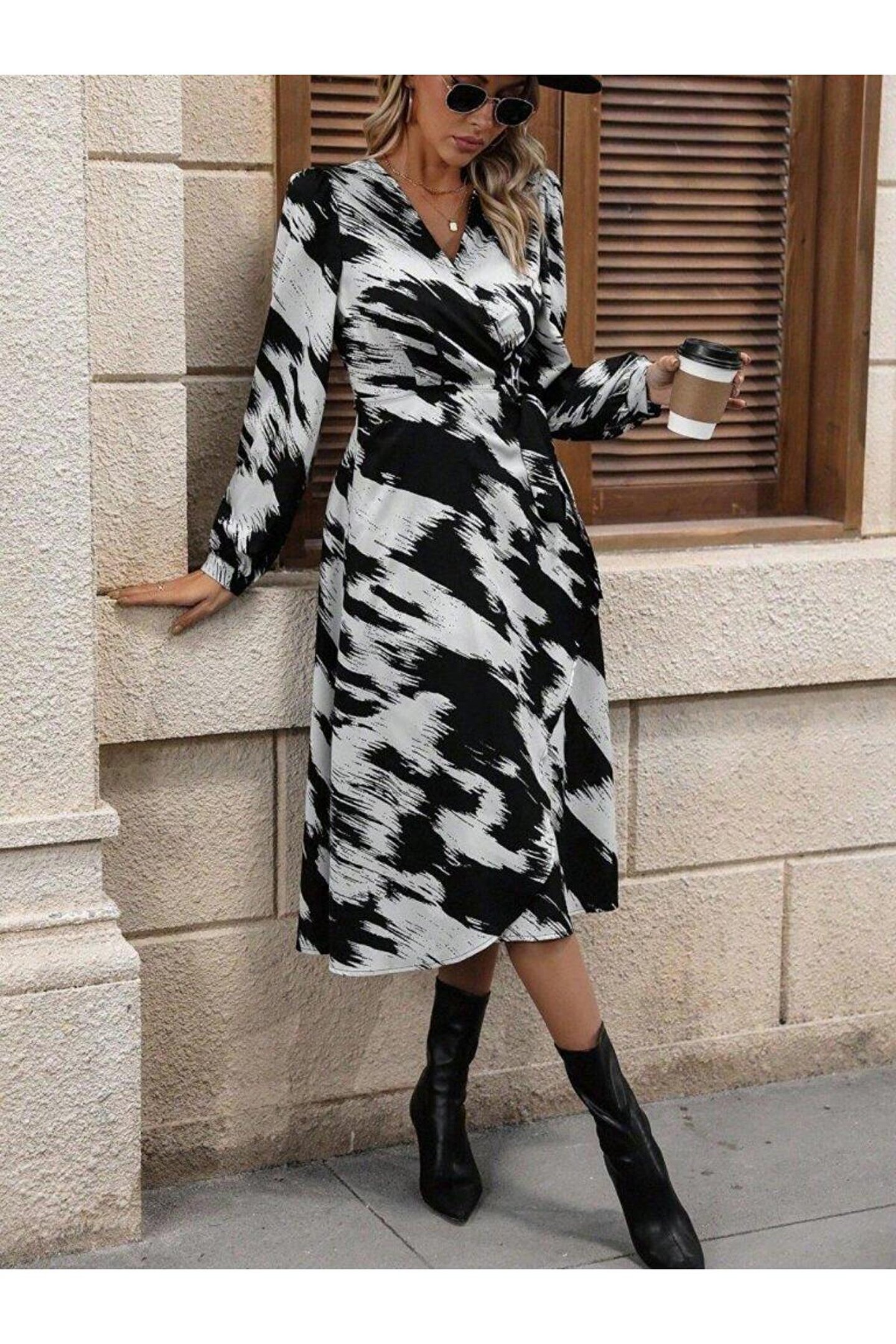 ARONA Kadın Uzun Kollu Kruvaze Yakalı Yandan Bağlamalı Desenli Mini Modal Elbise