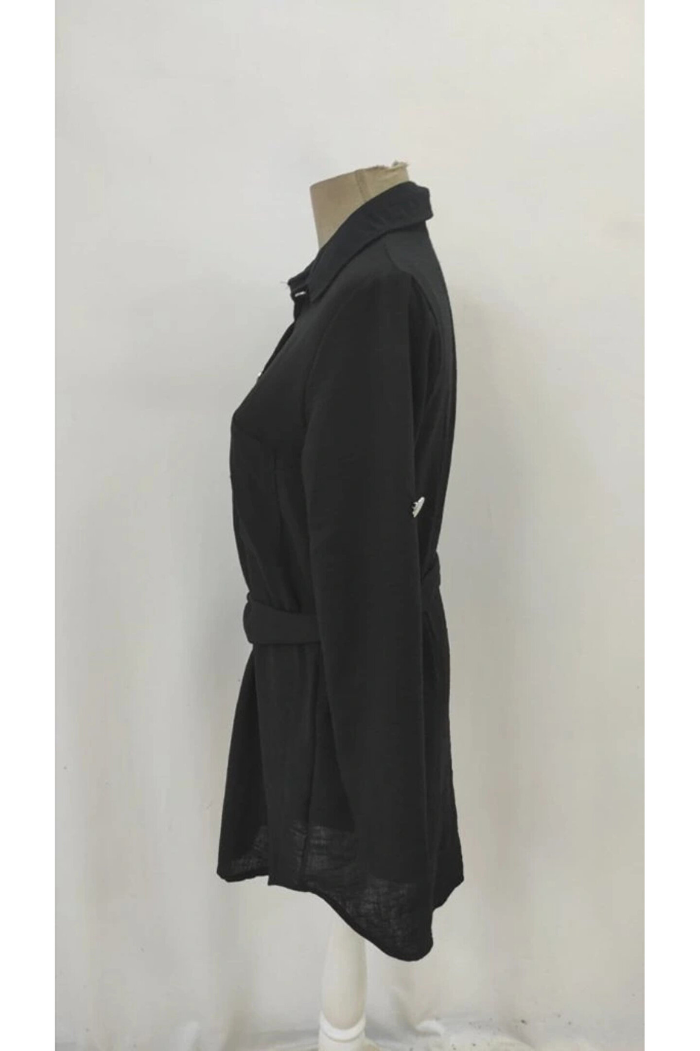 Kadın Uzun Kollu Yakalı önden Düğmeli Beli Kuşaklı Mini Ithal Keten Elbise