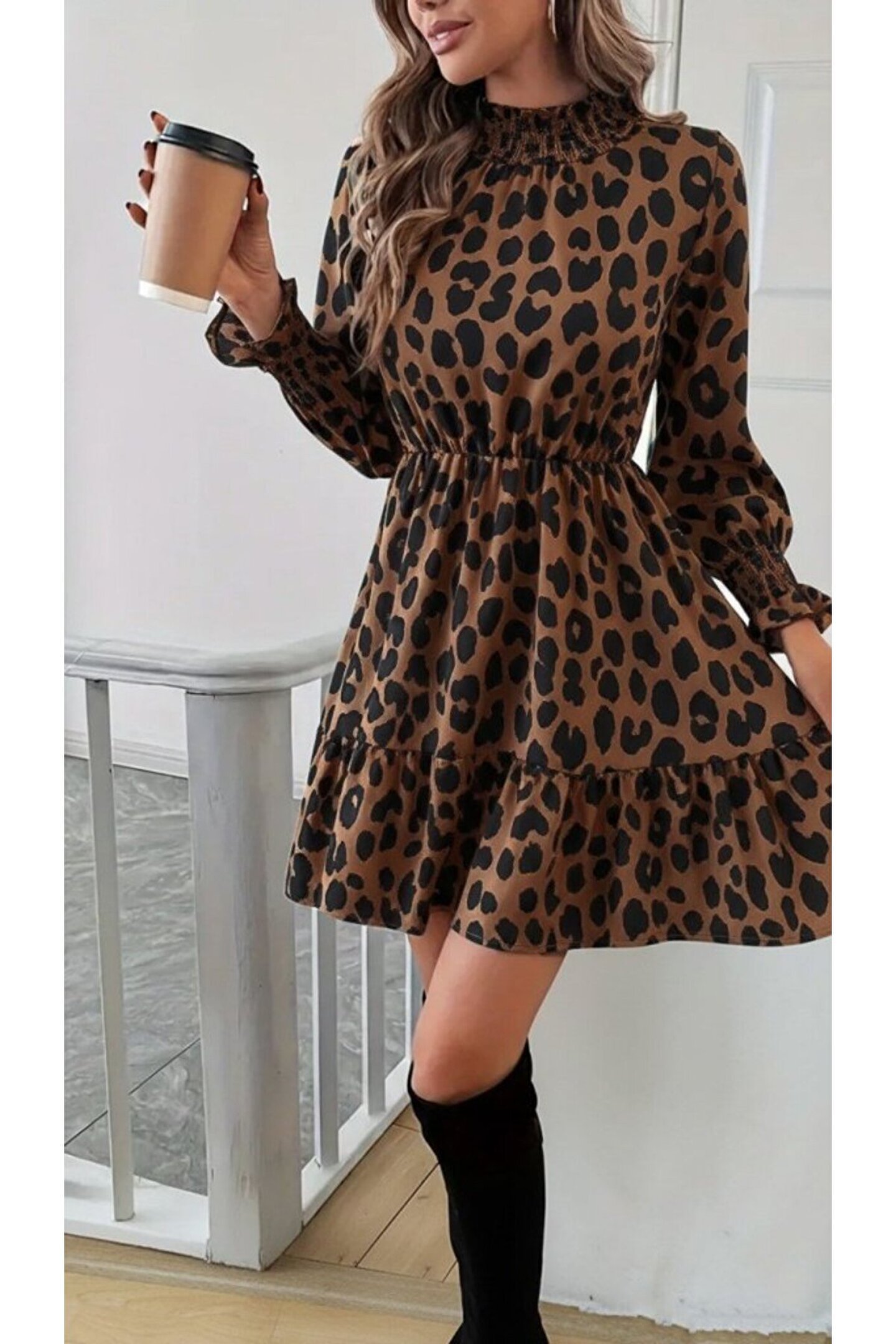 Kadın Uzun Kollu Yarı Balıkçı Yaka Leopar Desenli Modal Mini Elbise