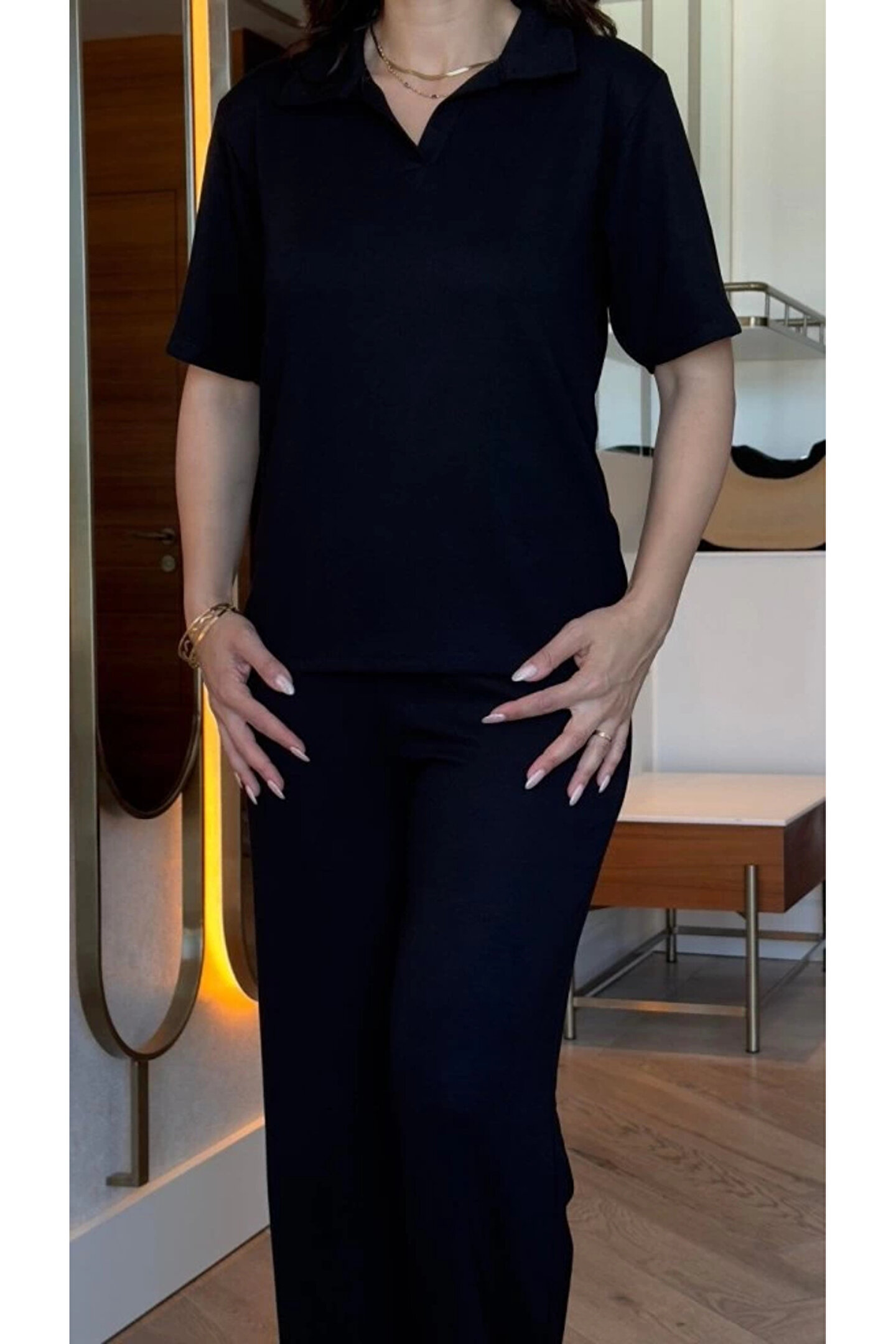 Kadın Kısa Kollu Yakalı Viskon Iki Iplik Bluz Ve Pantolon Ikili Takım