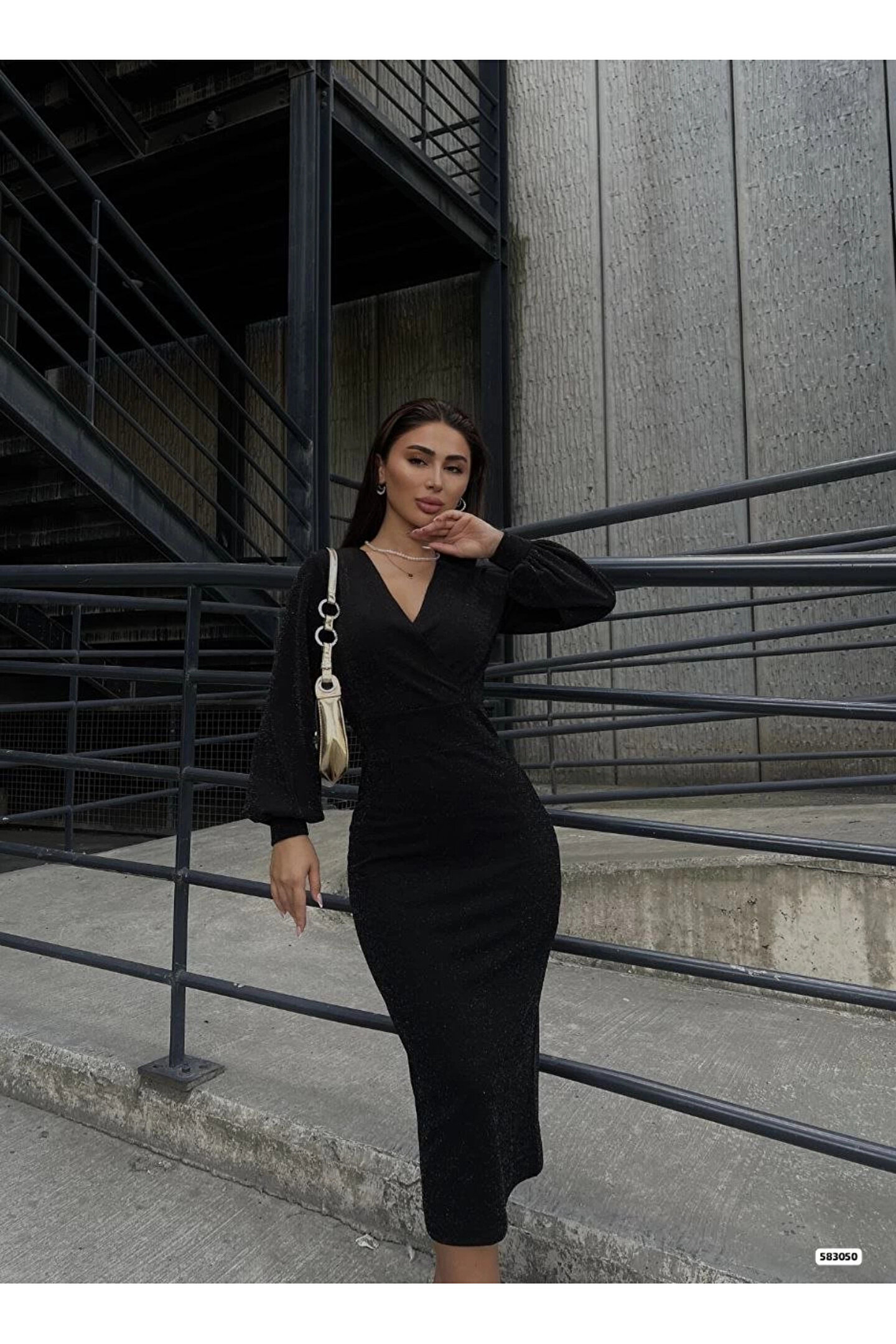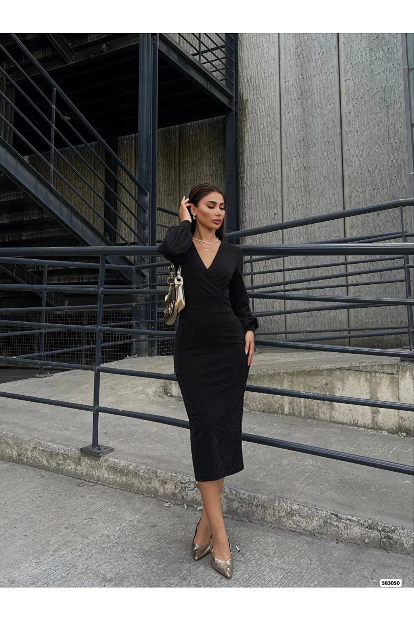 Kadın Kruvaze Yaka Balon Kol Simli Krep Kumaş Midi Boy Elbise