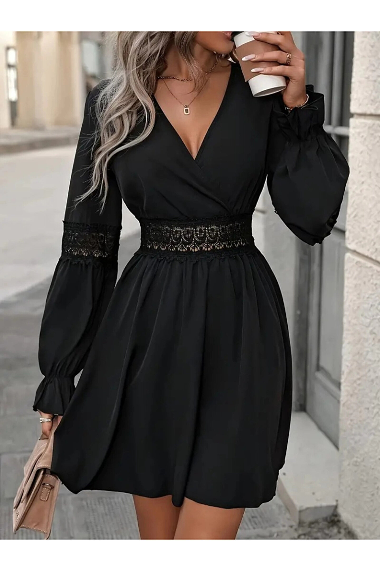 ARONA MDB Kadın Uzun Kollu Kruvaze Yakalı Dantelli Fermuar Detaylı Kısa Ithal Krep Elbise