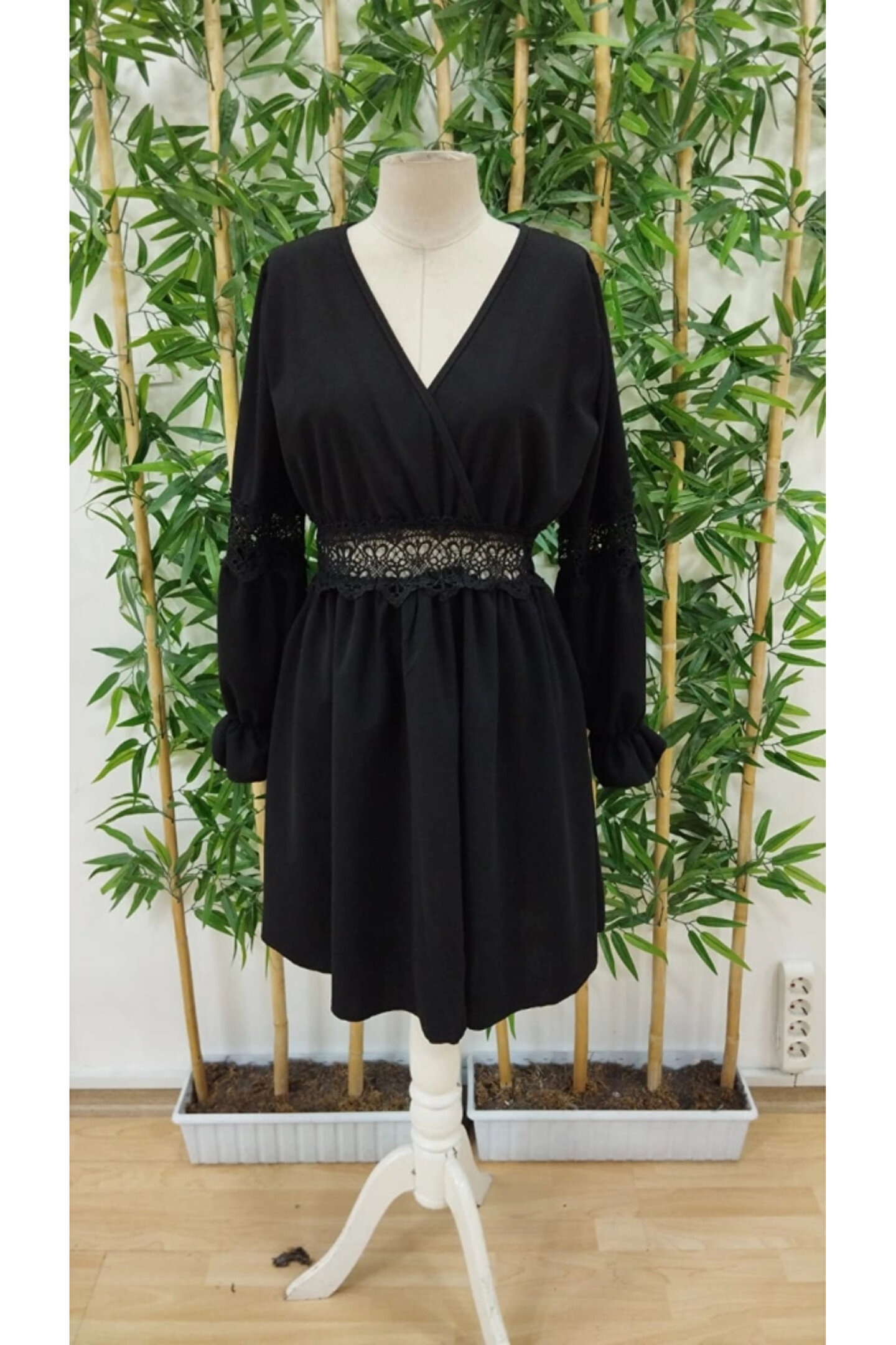 Kadın Uzun Kollu Kruvaze Yakalı Dantelli Fermuar Detaylı Kısa Ithal Krep Elbise