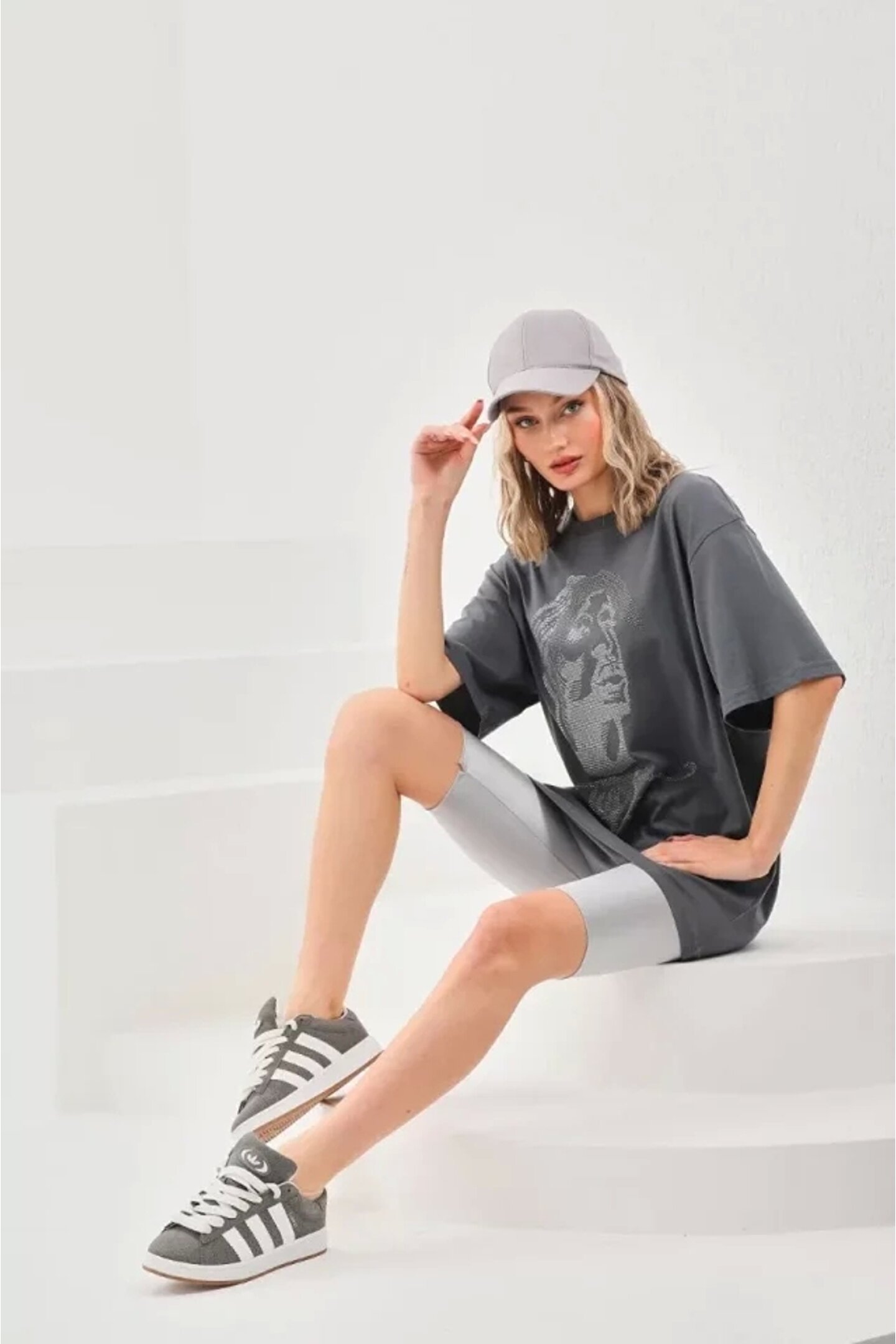 Unisex Taş Desenli Oversize T-Shirt - Füme