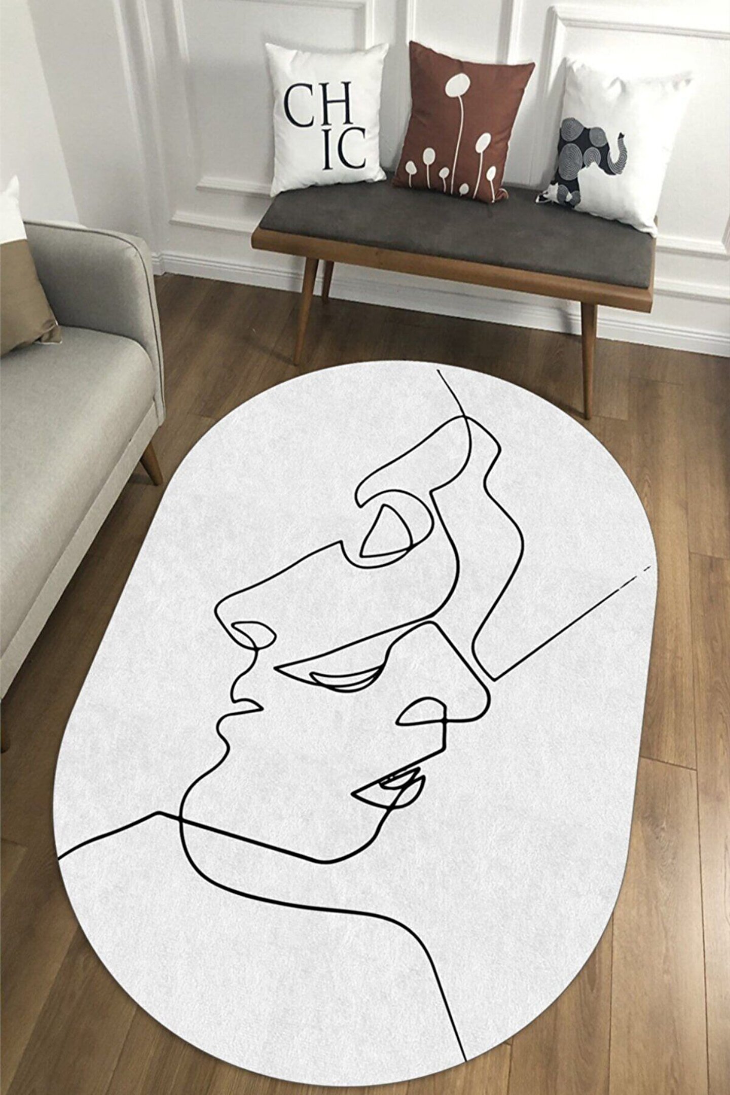 Beyaz Zeminli Minimalist Desenli Oval Halı