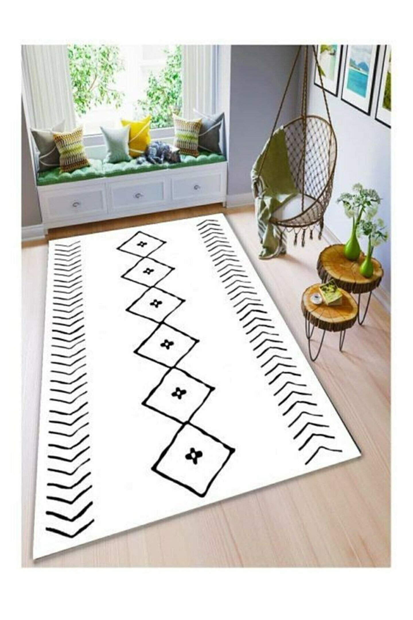 Dijital Baskı Yıkanabilir Kaymaz Taban Beyaz Zemin Prizma Desenli Yolluk Halı