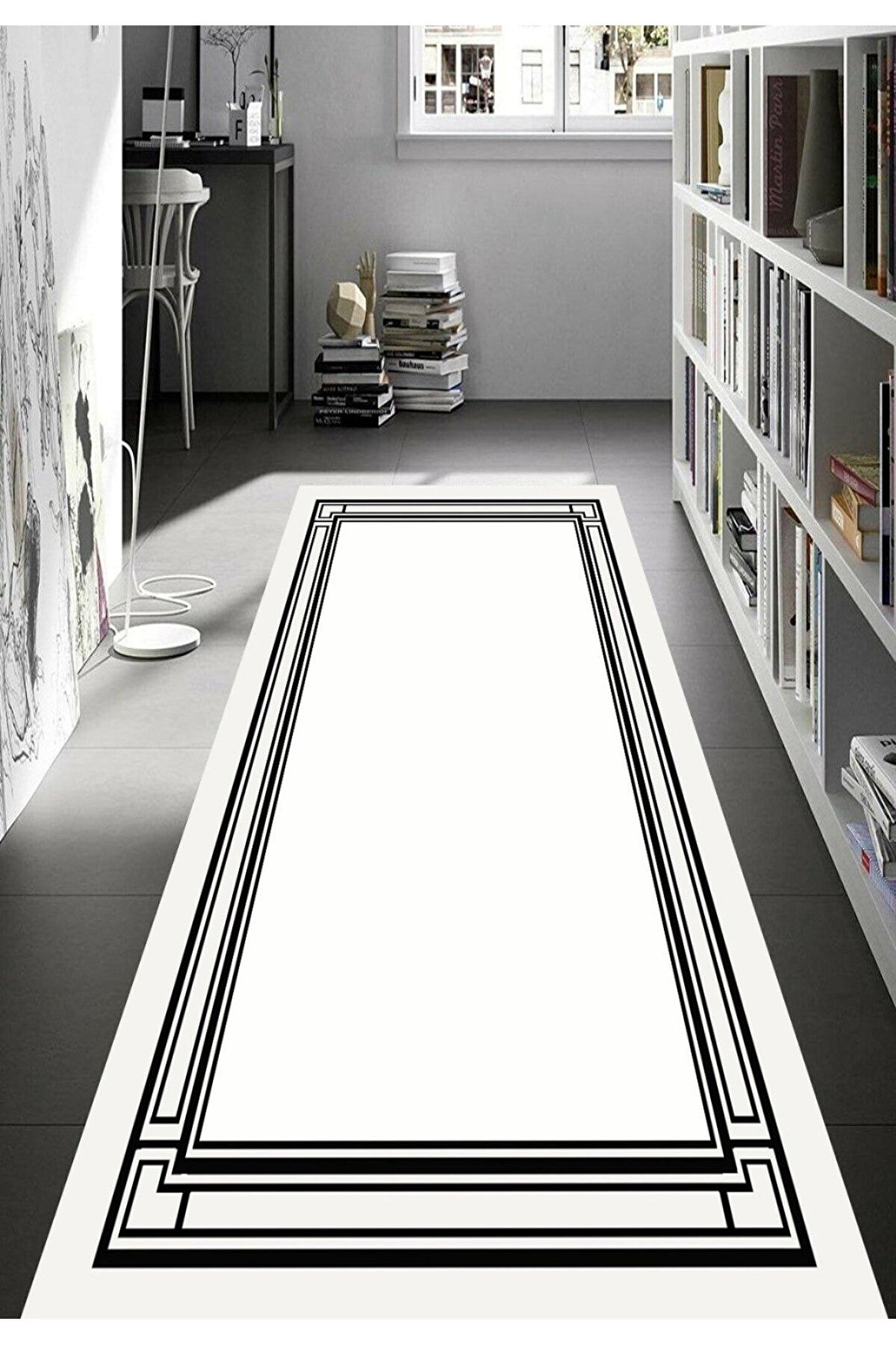 Dijital Baskı Yıkanabilir Kaymaz Taban Beyaz Zeminli Modern Çerçeveli Yolluk Halı