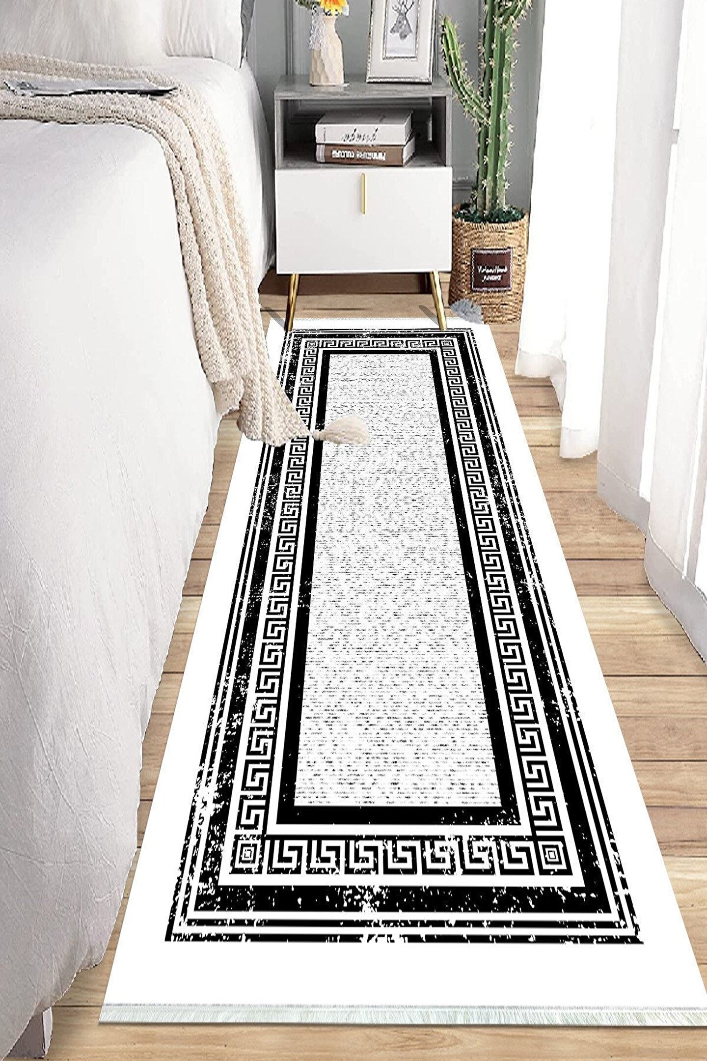 Dijital Baskı Yıkanabilir Kaymaz Taban Gri Siyah & Beyaz Çerçeveli Yolluk Halı Koridor Halısı