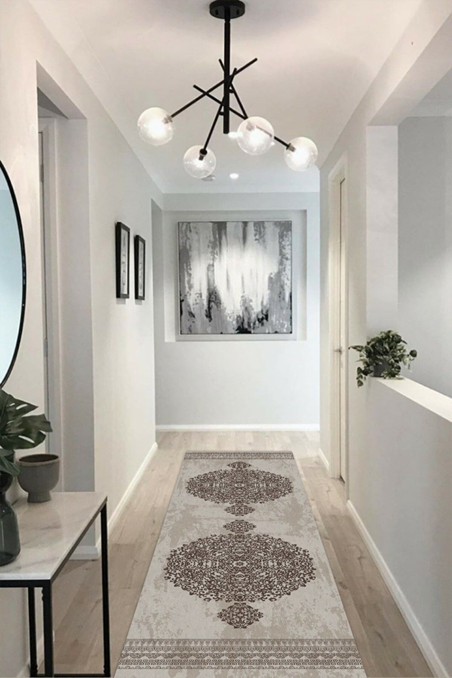 Dijital Baskı Yıkanabilir Kaymaz Taban Krem Zemin Kilim Desenli Kare Yolluk Halı