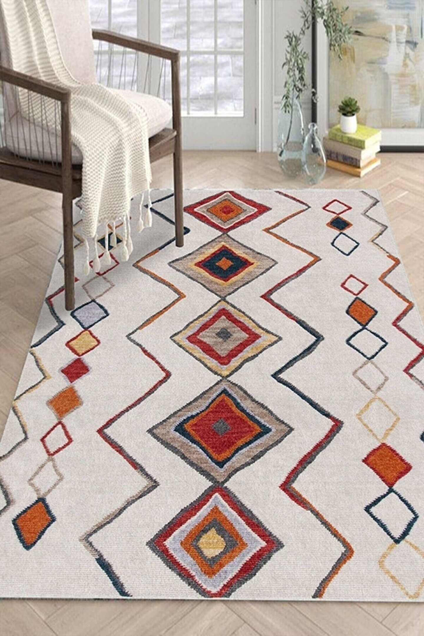 Dijital Baskı Yıkanabilir Kaymaz Taban Krem Zemin Renkli Kilim Desenli Yolluk Halı