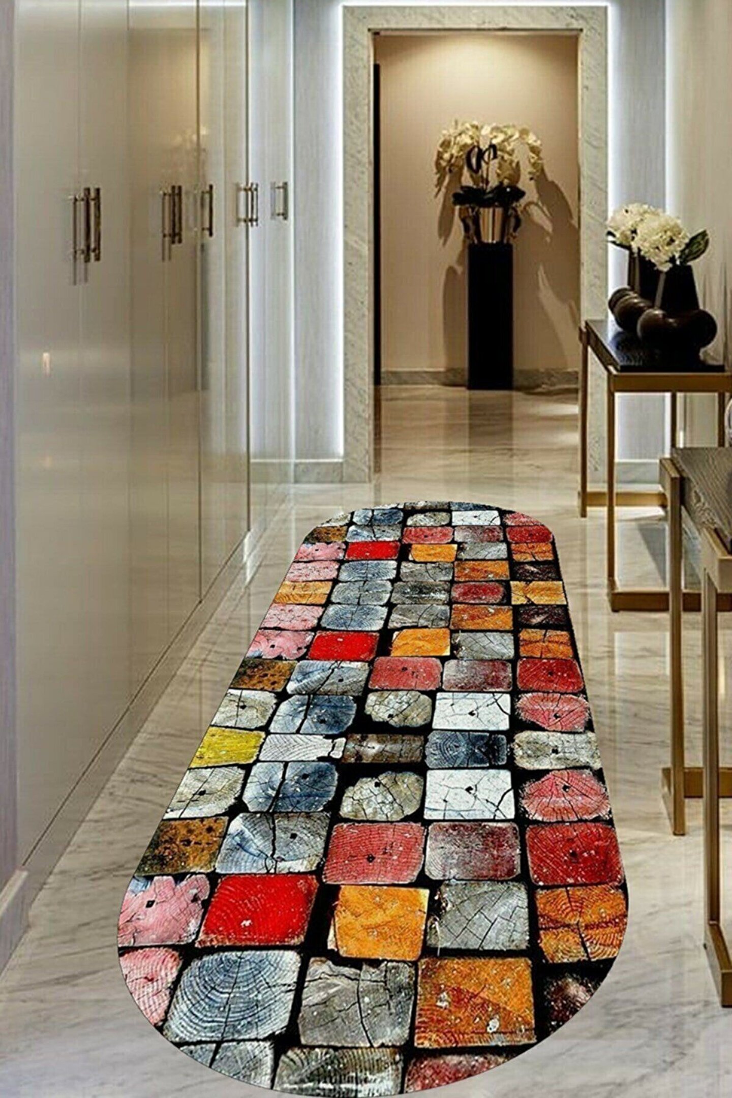 Dijital Baskı Yıkanabilir Kaymaz Taban Renkli Parke Motifli Oval Halı