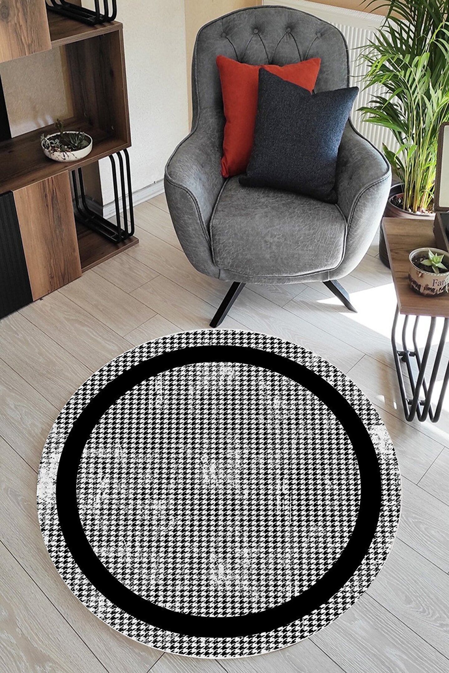 Dijital Baskı Yıkanabilir Kaymaz Taban Siyah Çizgili Yuvarlak Kilim Paspas Halı