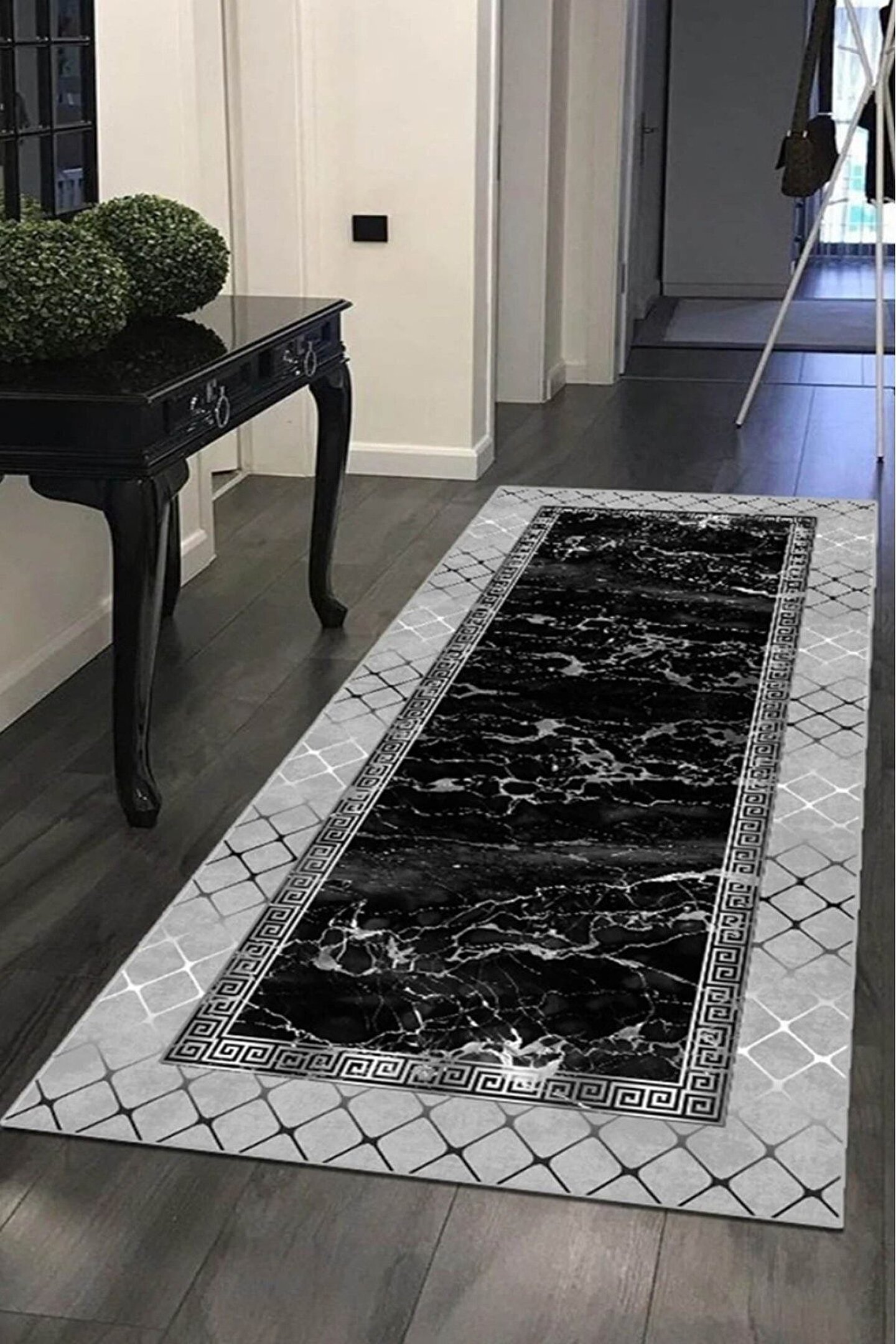 Dijital Baskı Yıkanabilir Kaymaz Taban Siyah&beyaz Gümüş Çerçeveli Modern Yolluk Halı Koridor Halısı