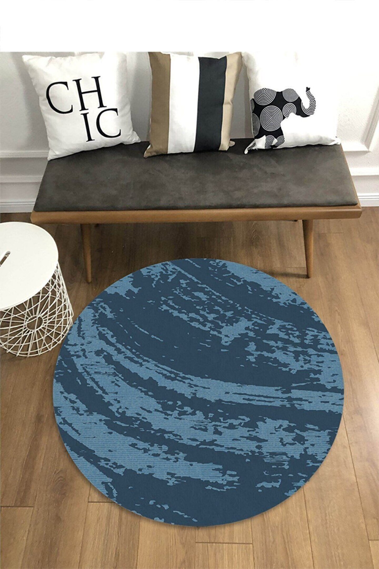 Mavi Eskitme Desenli Yuvarlak Halı