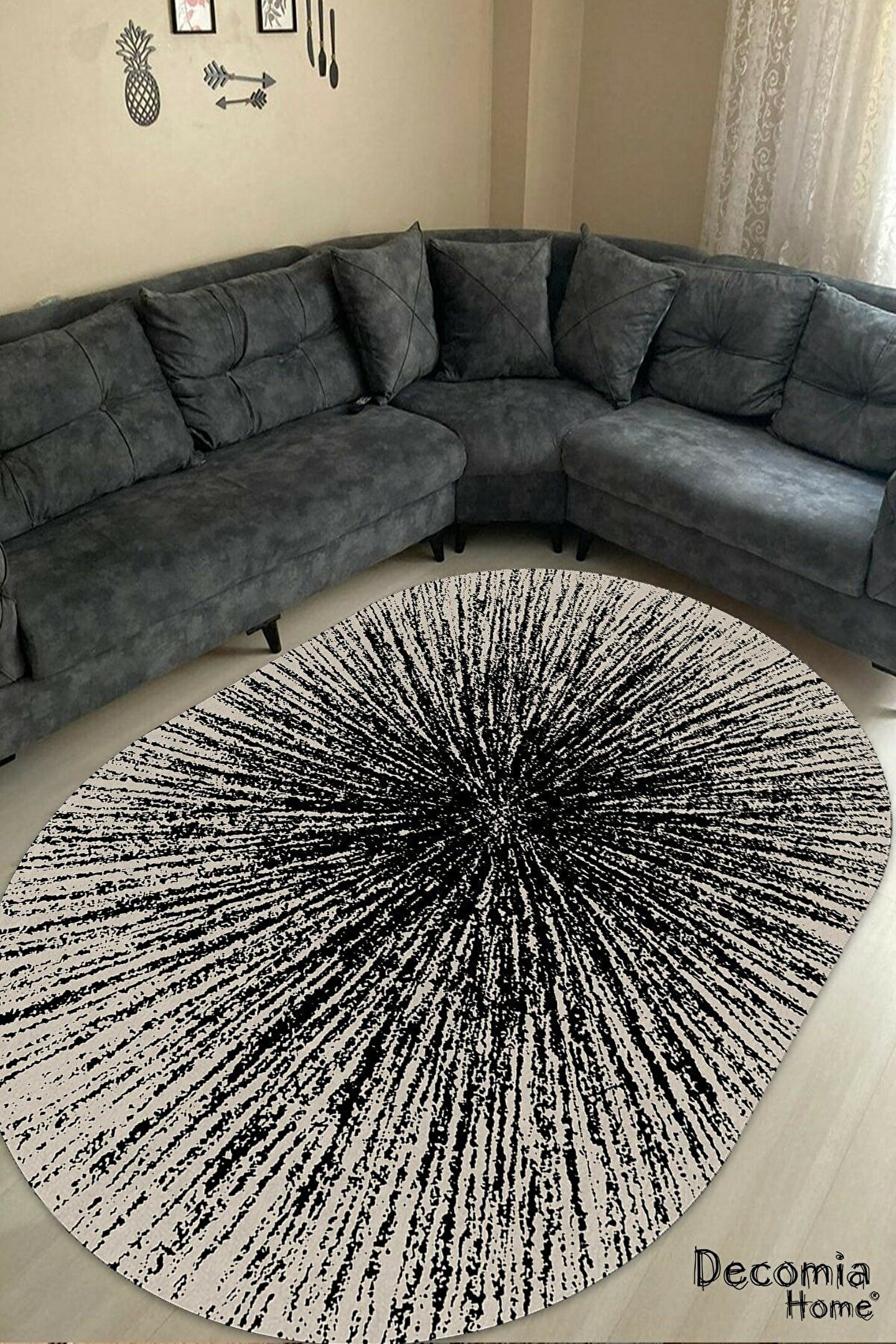 Siyah Püskürtme Desenli Oval Halı