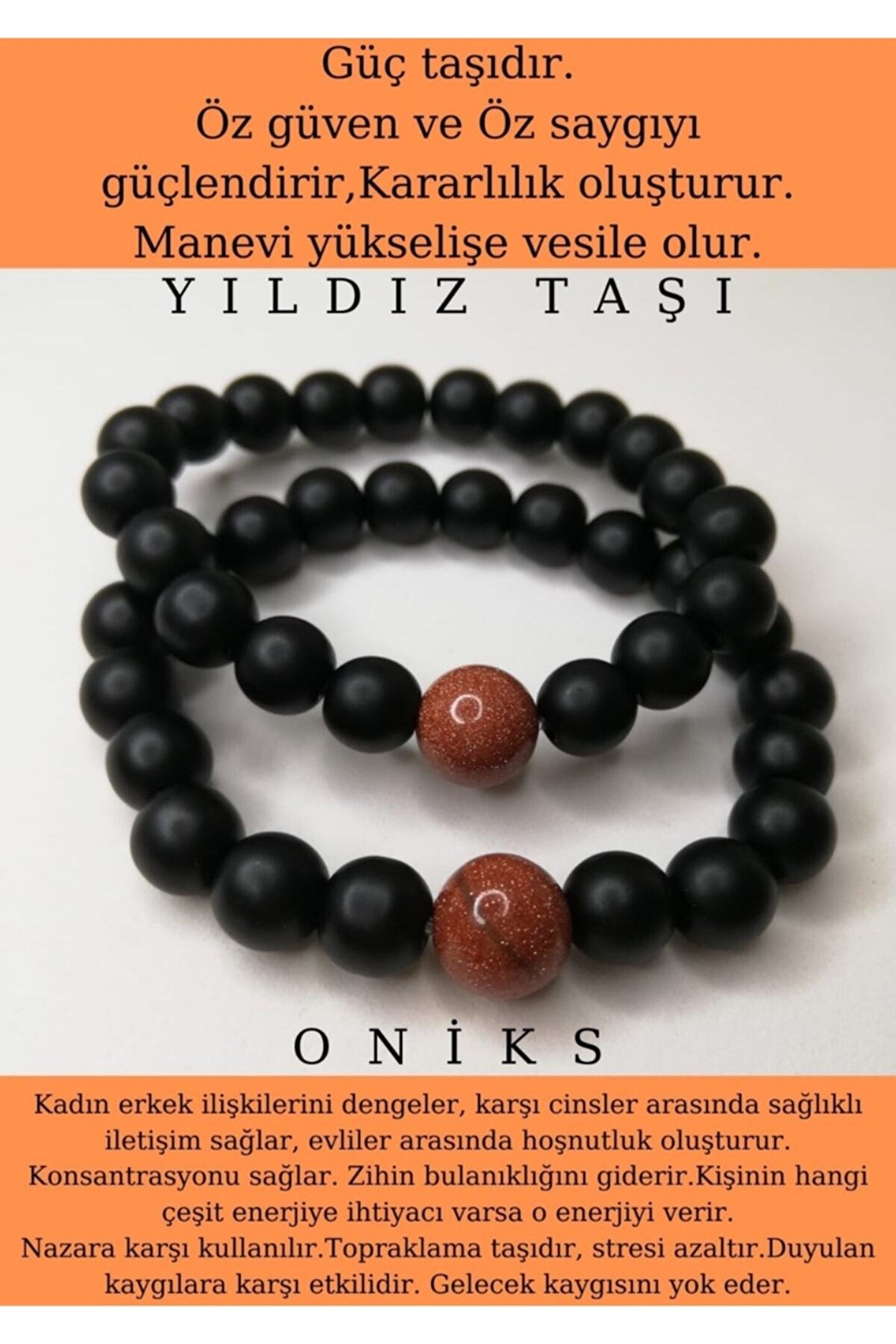 *Ürünümüz Orijinal Oniks ve Yıldız Taşı (Kum Taşı)' dan hazırlanmaktadır.; Sevgili Bilekliğidir.; 2'li Satılmaktadır.; Taşların boyutu Onik 8mm.; Yıldız Taşı 10m dir.; Elastik misina kullanılmıştır.; Paketlemede yedek taş ve misina koyulmaktadır.; *Yıldız Taşı (Kum Taşı) Faydaları; Güç taşıdır Öz güven ve Öz saygıyı güçlendirir, Kararlılık oluşturur.; Manevi yükselişe vesile olur.; Duygusal denge sağlar.; Heyecan, öfke, alınganlık gibi aşırı duyguları dengeler, Mutluluk, huzur, dinginlik sağlar Duygusal denge sağlar, heyecanları, alınganlıkları, aşırı duygulanmaları dengeler.; Diplomatik şekilde davranma yeteneği ve zenginlik verdiğine, tehlikelerden koruduğuna inanılmıştır.; Yüksek tansiyonu indirir, dengeler.; Yüksek enerjili bir taştır ve kullanan kişiye pozitif enerji verir, enerjiyi depolar ve muhteviyatındaki bakır sayesinde bedene yayılmasını sağlar, Dışarıdan gelen negatif, olumsuz enerjiyi toplar ancak geri yansıtır, Metabolizmayı güçlendirir, Sezgi gücünü artırır.; Romatizma ve Arterit (Eklem iltihabı) ağrılarını hafifletir.; *Oniks Taşının Faydaları; Kadın erkek ilişkilerini dengeler, karşı cinsler arasında sağlıklı iletişim sağlar, evliler arasında hoşnutluk oluşturur.; Konsantrasyonu sağlar.; Zihin bulanıklığını giderir.; Kişinin hangi çeşit enerjiye ihtiyacı varsa o enerjiyi verir.; Nazara karşı kullanılır.; Topraklama taşıdır, stresi azaltır.; Duyulan kaygılara karşı etkilidir.; Gelecek kaygısını yok eder.; *Taşlarınızı Haftada bir kez Su da 5dk.; yıkayabilir, tütsüleyebilir veya topraklama yaparak temizleyip ,arındırabilirsiniz.; Böylelikle taşların enerjilerini daha iyi hissedebilirsiniz.