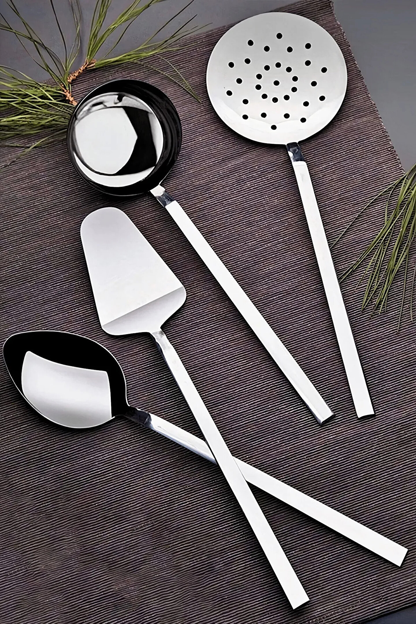 1 Adet: Paslanmaz Çelik Servis Kepçe ; 1 Adet: Paslanmaz Çelik Servis Kevgir ; 1 Adet: Paslanmaz Çelik Servis Kaşık ; 1 Adet: Paslanmaz Çelik Servis Spatula ; YÜKSEK KALİTE PASLANMAZ ÇELİK: Ürünlerimiz kolayca paslanmayacak veya bükülmeyecek ve bulaşık makinesinde yıkanabilir yüksek kaliteli gıda sınıfı 304 kalite paslanmaz çelikten üretilmiştir. Kararma yapmaz, uzun ömürlü çok dayanıklıdır. Elde ve makinede güvenle yıkayabilirsiniz. ; KOLAY TEMİZLENİR: Ayna cilalı yüzey ürünü kullandıktan sonra hızlı bir şekilde temizlemenizi sağlar, ilk günkü gibi parlaklığını korur. ; FIRSAT PAKETİ: Mutfağınızda sürekli ihtiyacınız olan 4 farklı ürüne tek tek çok daha fazla ücret ödeyip satın almak yerine, hepsi 1 arada fırsat paketi olarak çok daha uygun fiyata sahip olabilirsiniz. ;