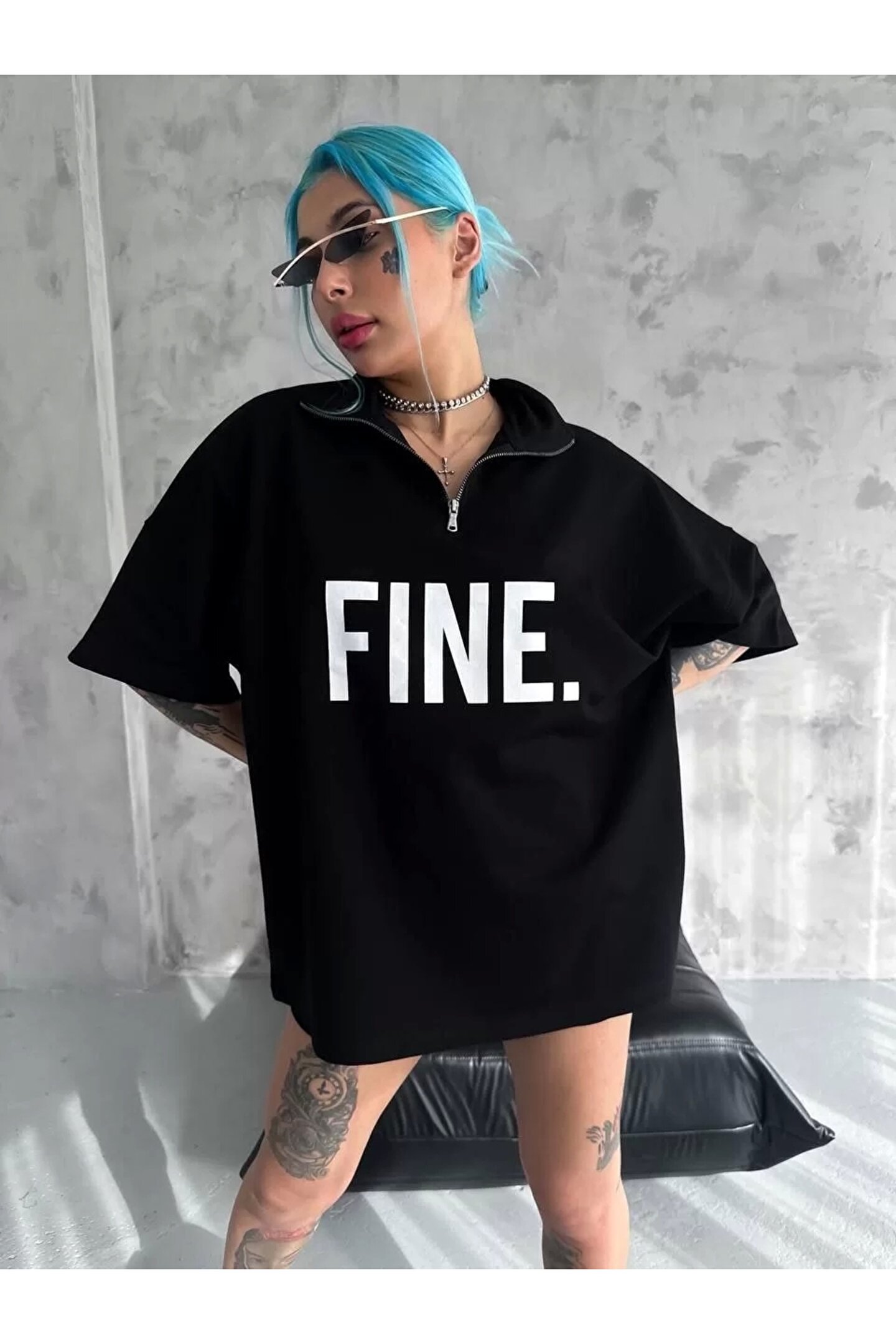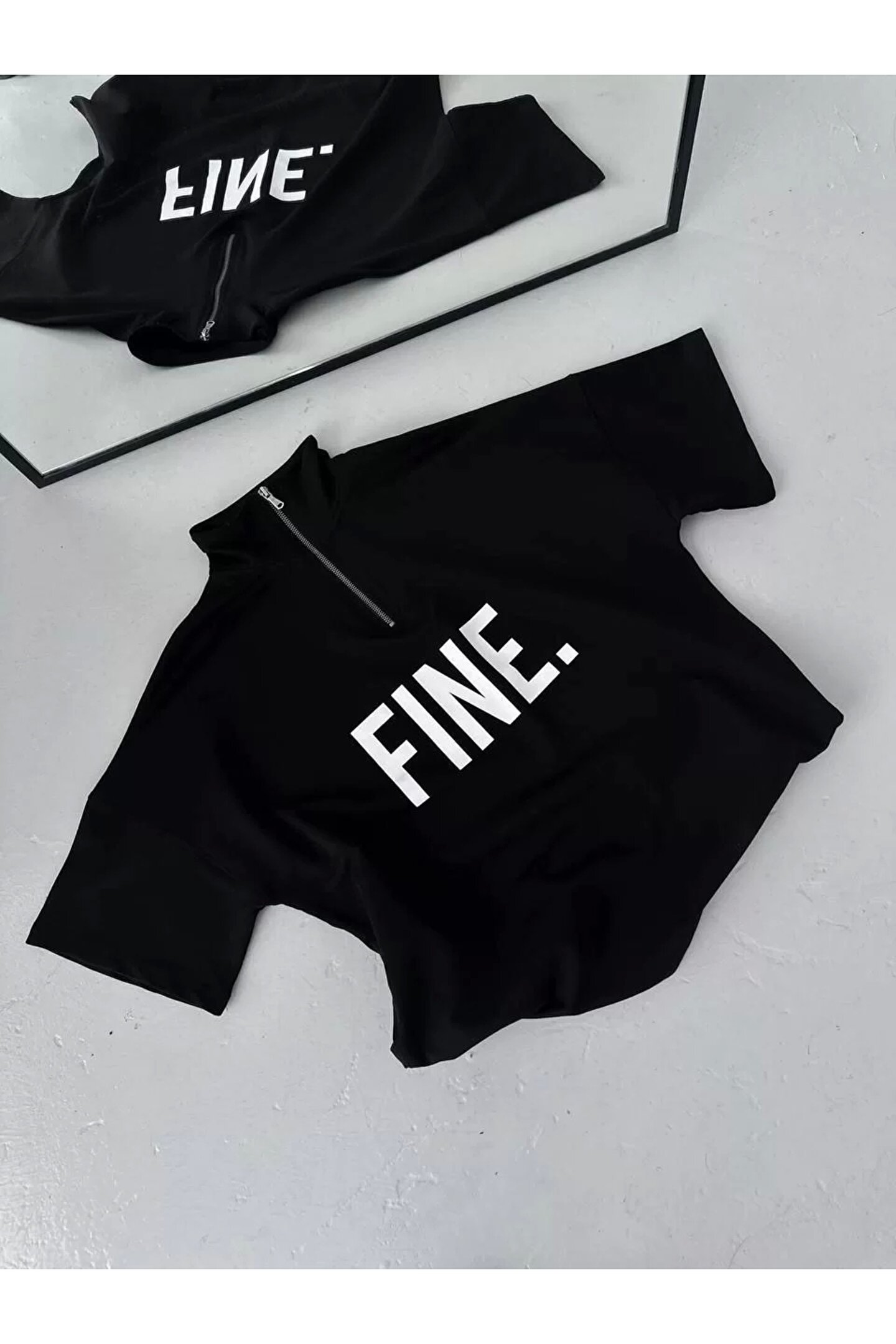 Unisex Baskılı Yarım Fermuarlı T-Shirt - Siyah