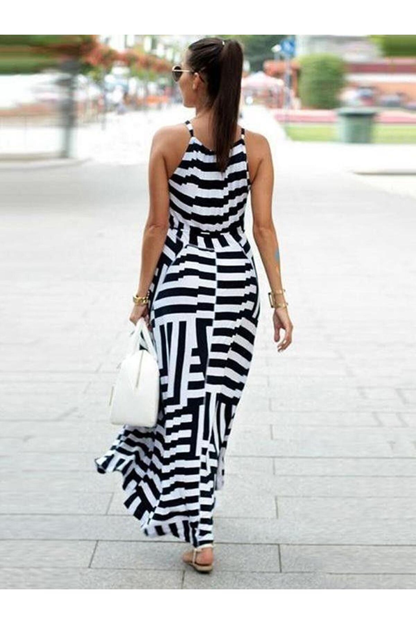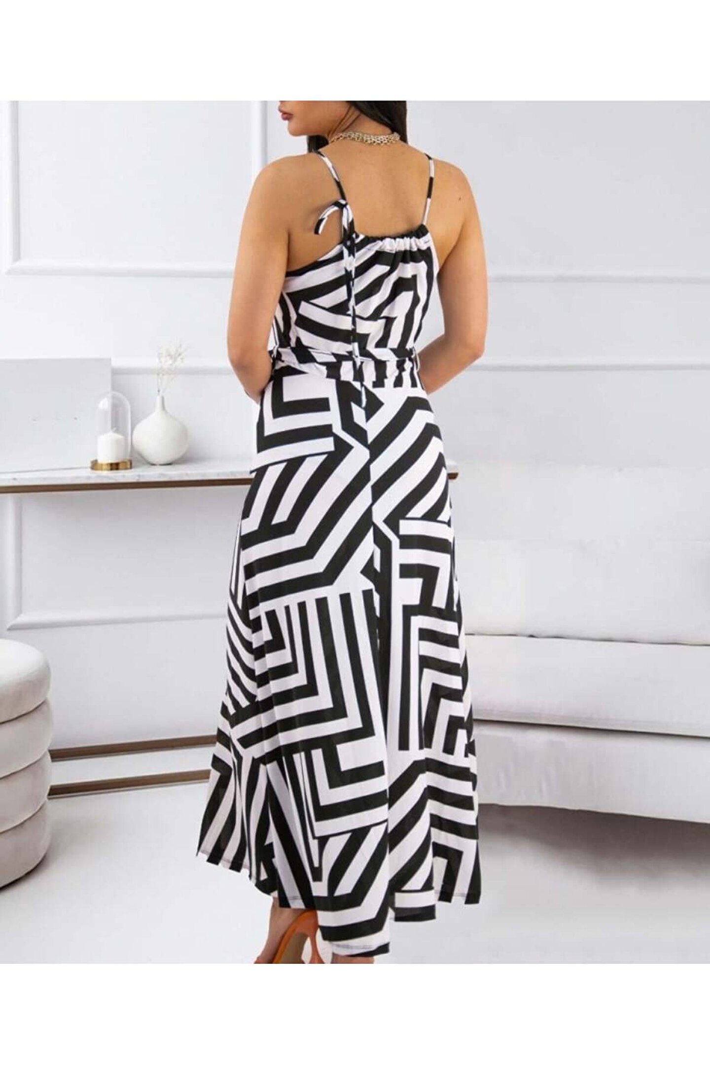 Kadın Askılı Belden Bağlamalı Geometrik Desen Krep Elbise