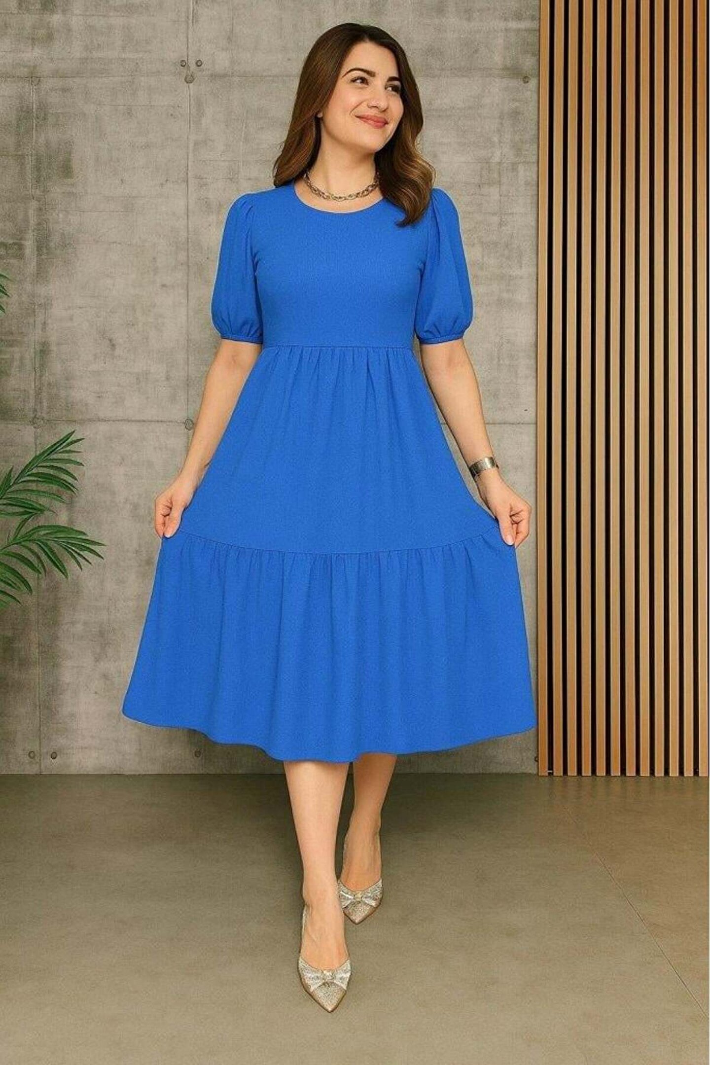ASIA GİYİM Kadın Kısa Kollu Yakası Açık Katlı Bürümcük Balon Elbise