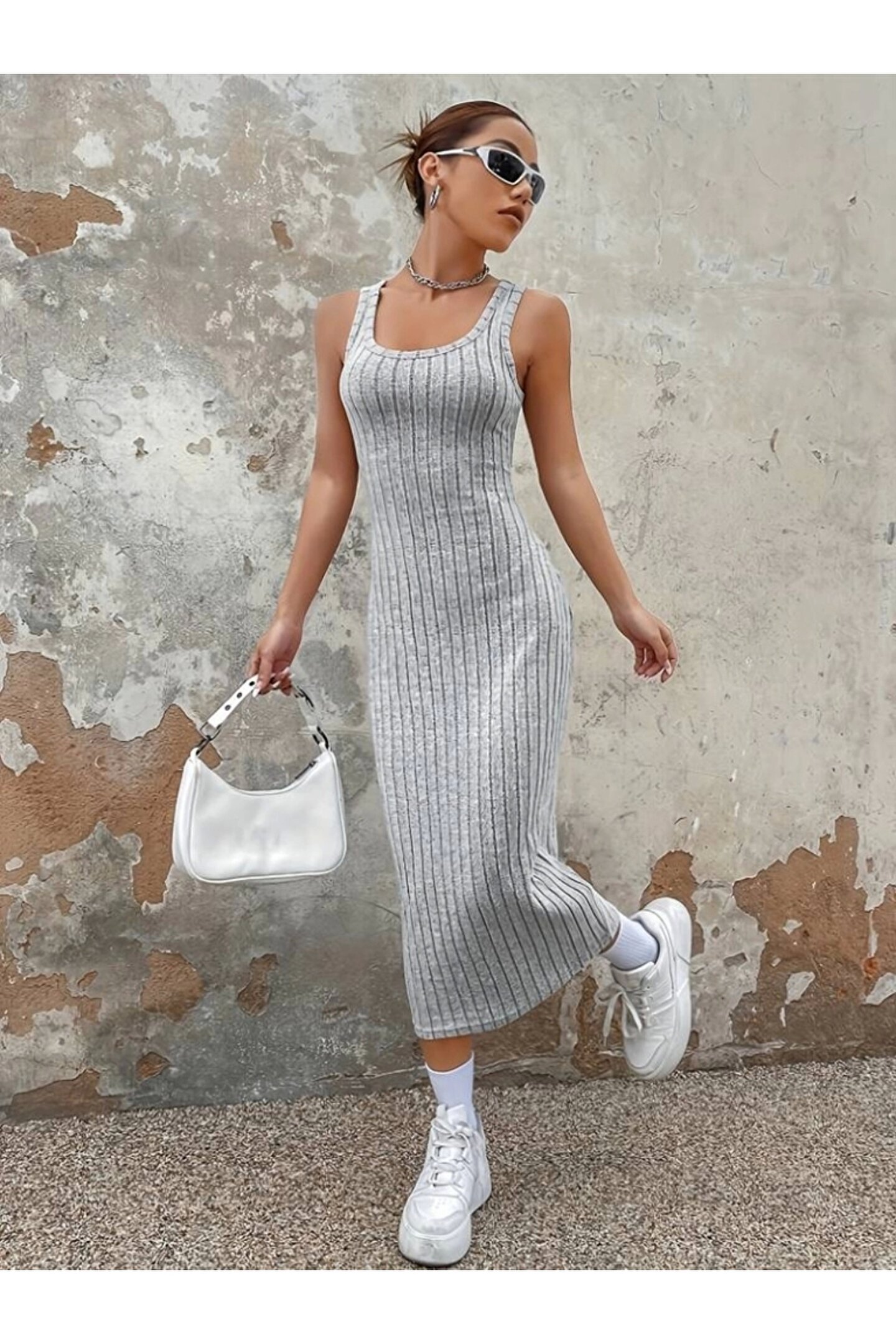 Kadın Kalın Askılı Kare Yaka Fitilli Kaşkorse Midi Boy Elbise