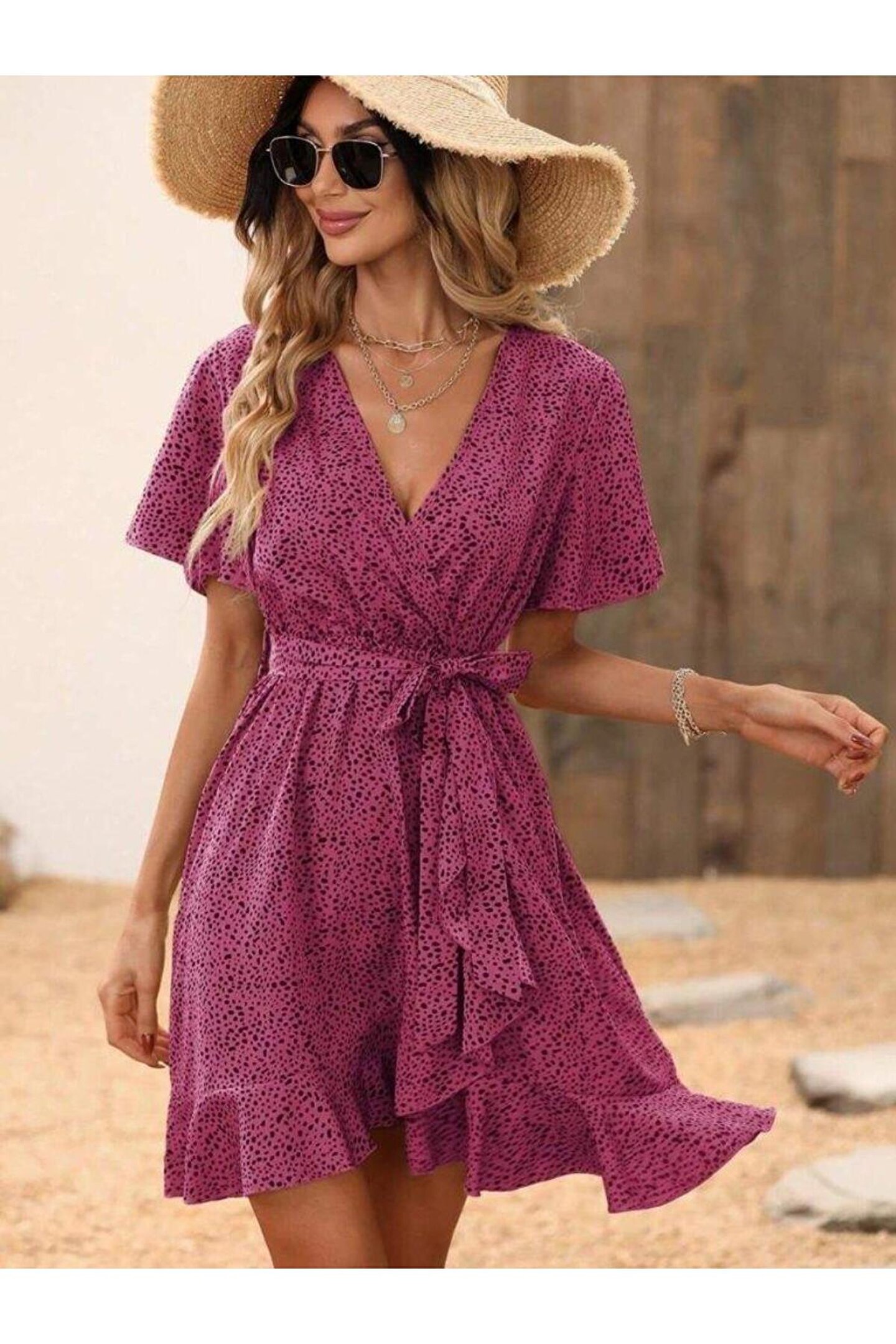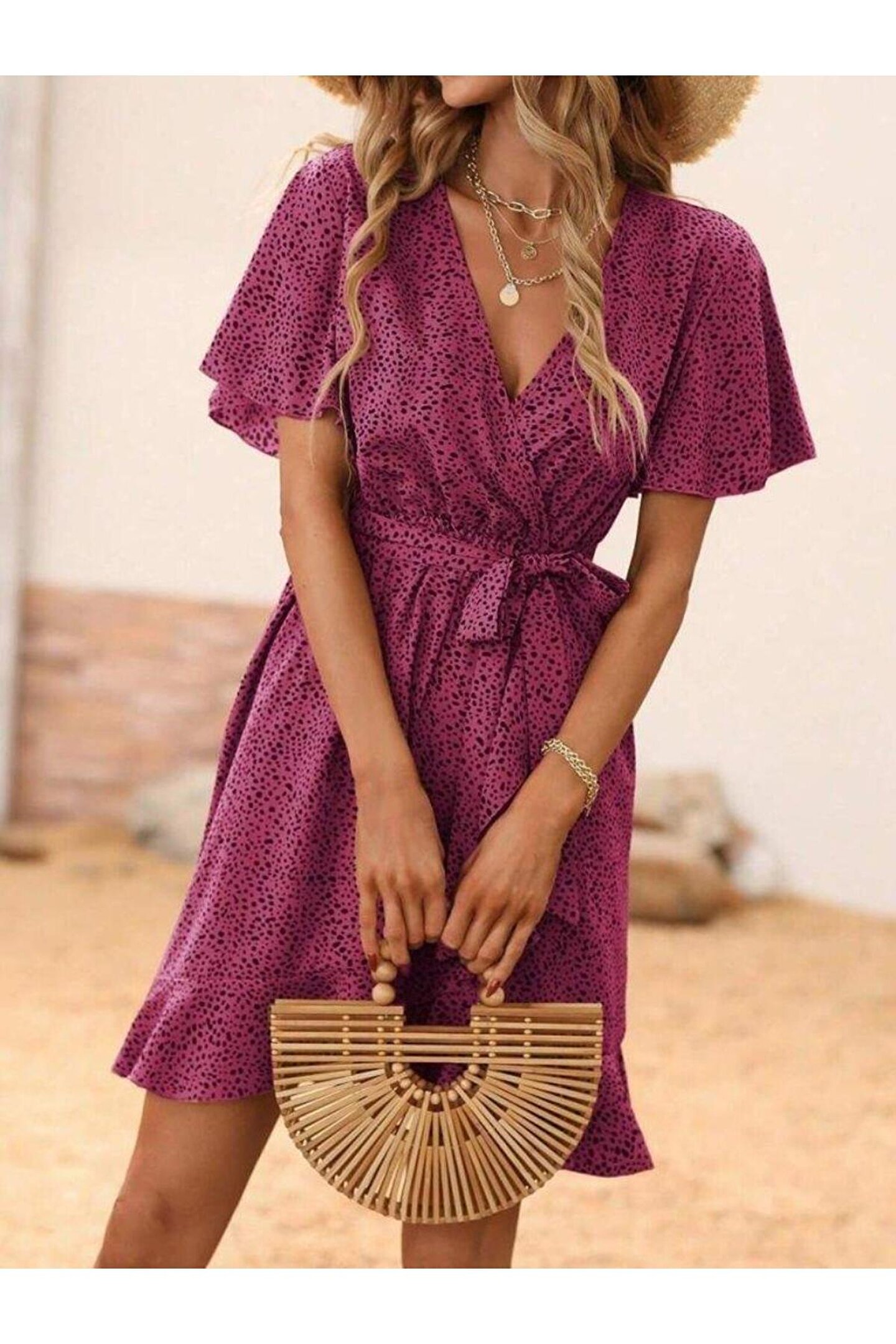 Kadın Kısa Kelebek Kollu Kruvaze Yakalı Belden Kuşaklı Kısa Desenli Süprem Elbise Hediye paketi yapılır