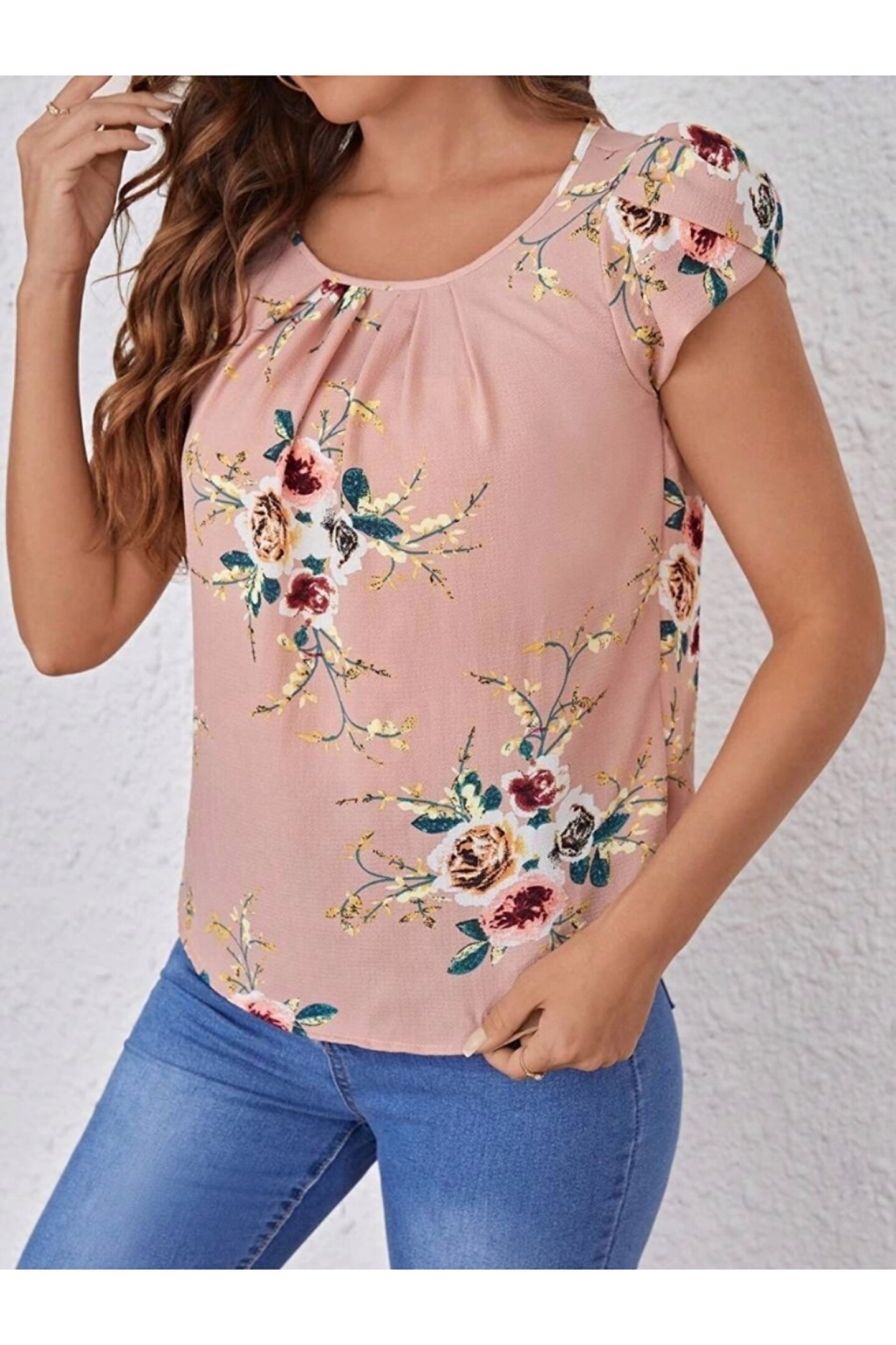 Kadın Kısa Kollu Bisiklet Yaka çiçek Baskılı Süprem Bluz