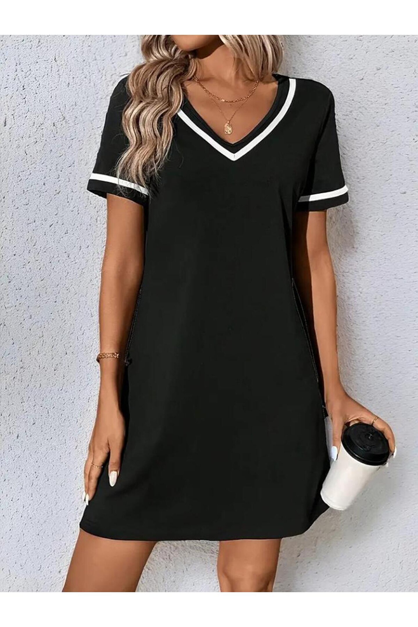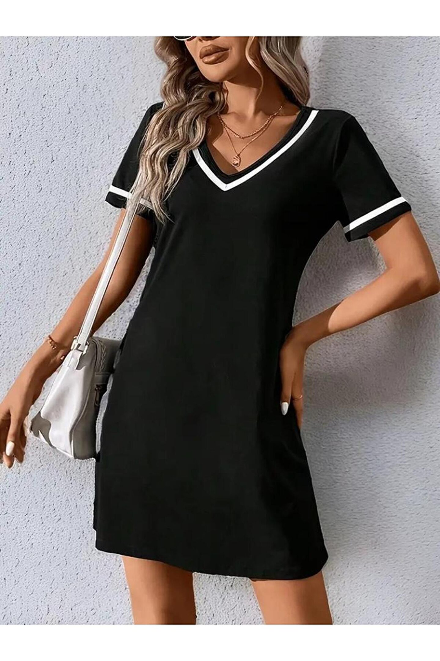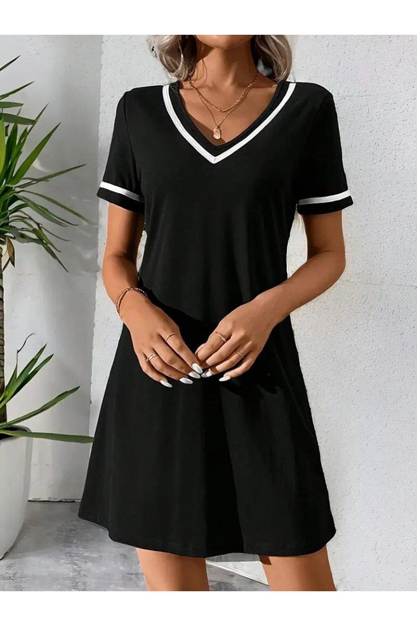 Kadın Kısa Kollu V çizgili Yakalı Kısa Viskon Elbise
