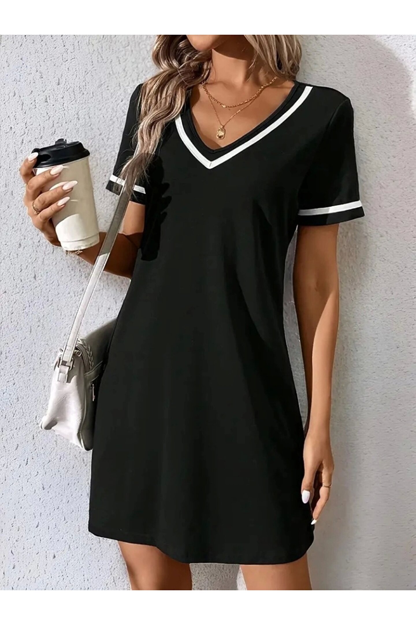 Kadın Kısa Kollu V çizgili Yakalı Kısa Viskon Elbise