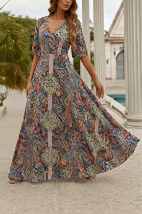 Kadın Kısa Kollu V Yakalı Desenli Süprem Elbise