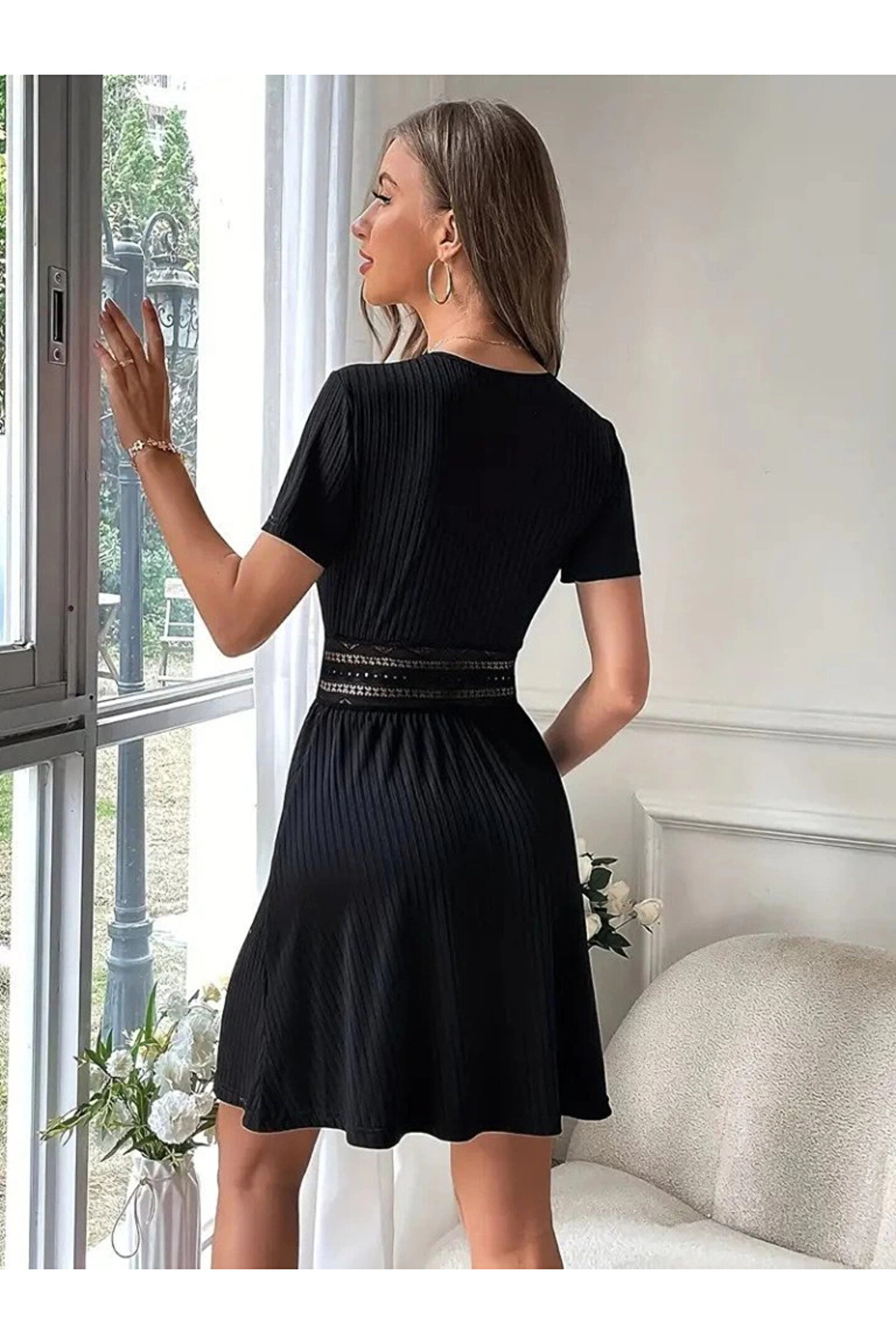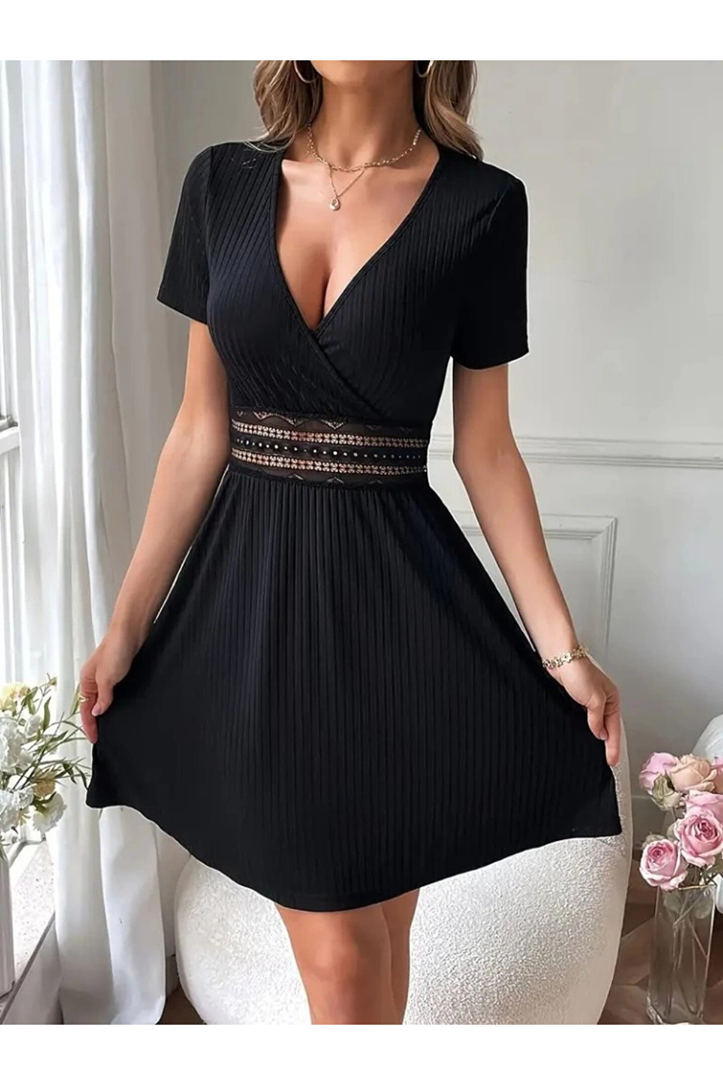 Kadın Kısa Kollu Kruvaze Yakalı Belden Dantelli Kaşkorse Elbise