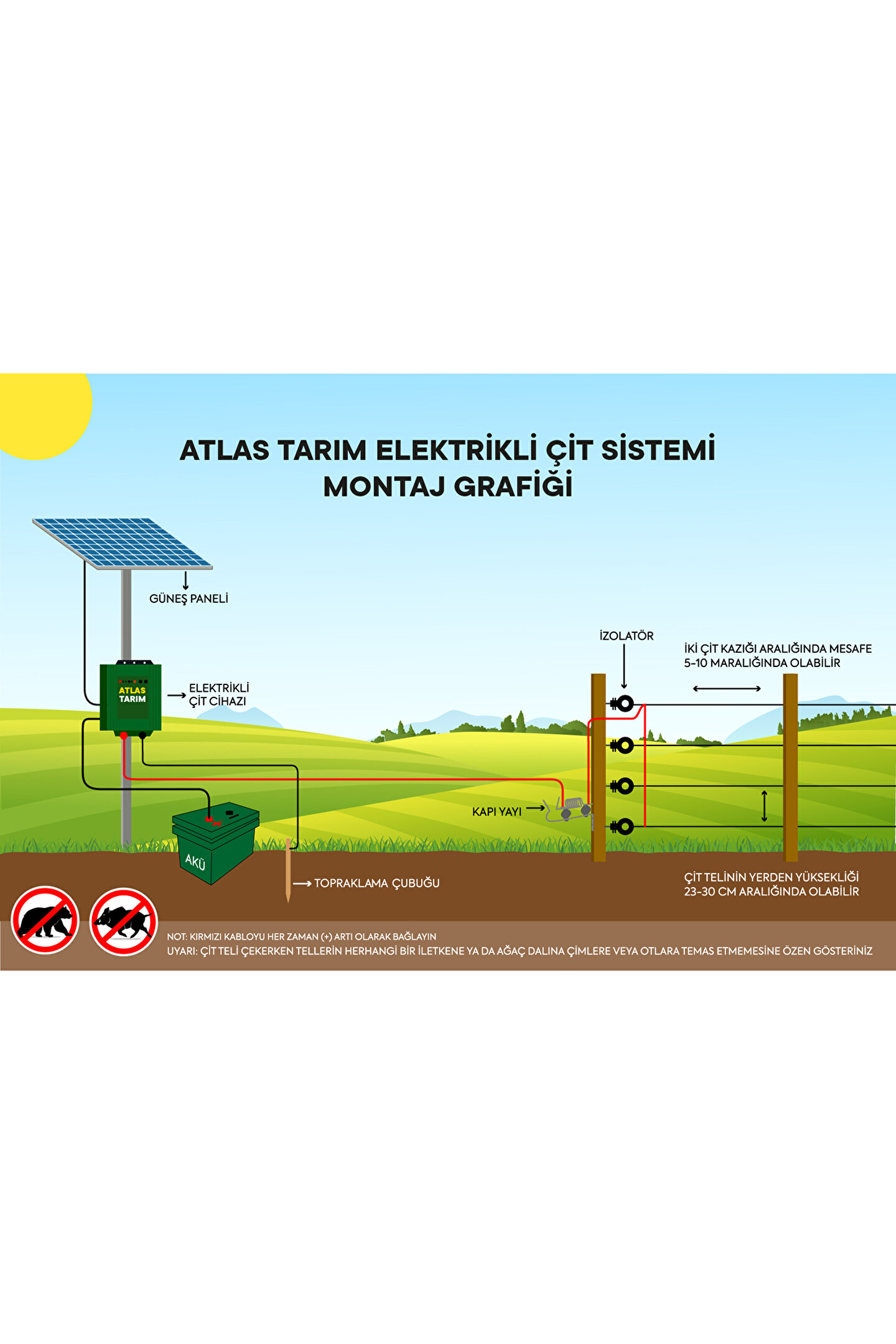 ATLAS MARKA TÜM ELEKTRONİK CİHAZLARDA 5 YIL GARANTİ MEVCUTTUR. KURULUM DESTEĞİ ÜCRETSİZ VERİLMEKTEDİR. HER YIL CİHAZ ALMANIZA GEREK YOK ÖMÜRLÜK BİR SİSTEMDİR. AKÜ YERİNE Lİ-PO BATARYA SİSTEMLERİMİZDE MEVCUTTUR. *****RESİMDE GÖRÜLEN TÜM ÜRÜNLER TARAFINIZA GÖNDERİLMEKTEDİR.***** Atlas Elektrikli Çit Sistemi Paket İçeriği: Elektrikli Çit Cihazı 30.000 VOLT Tesirli Gece Gündüz Sensörlü Korumalı Devreli; 25 Watt Güneş Paneli 10 Yıl Garanti; 12 Volt 7 Amper Kuru Akü Yeni Tarihli; Kapı Yayı Seti; 500 Metre Krom Tel Kaplamalı Elektrikli Çit İpi; 50 Adet Vidalı İzalatör; Bakır Bağlantı Kabloları; Paslanmaz Topraklama Çubuğu; İzalatör Sıkma Aparatı; Elektrikli Çit Uyarı Levhası; Kullanım Klavuzu; Kurulum Desteği Ücretsiz; Atlas Elektrikli Çit Sistemi, tarım ve hayvancılık alanında sınırlarınızı koruma, güvenliği artırma ve verimliliği optimize etme konusunda mükemmel bir çözümdür. Güçlü elektrikli çit sistemimiz, dayanıklı malzemeler ve ileri teknolojiyi bir araya getirerek kullanıcılara uzun ömürlü ve etkili bir çit deneyimi sunar. Bu çit sistemimiz, AKÜ, GÜNEŞ PANELİ, ADAPTÖR ile çalışabilmektedir. CİHAZ 30.000 METRE TESİRLİDİR 25 WATT GÜNEŞ PANELİ KULLANILMAKTADIR. GECE GÜNDÜZ SENSÖRÜ SAYESİNDE ENERJİ TASARRUFU SAĞLAR. ÖZEL TASARIMLI KUTU SAYESİNDE ISLANMA PROBLEMİ YAŞAMAZSINIZ. CİHAZIMIZDA KISA DEVRE KONTROLÜ MEVCUTTUR. 7-9 AMPER AKÜ İLE 7 GÜN GÜNEŞ GÖRMEDEN ÇALIŞABİLİR. 14 AMPER AKÜ İLE 14 GÜN GÜNEŞ GÖRMEDEN ÇALIŞABİLİR KULLANIM ALANLARI Tarım Alanları: Tarla sınırlarını koruma; Hasat dönemlerinde tarım ürünlerini çalıntıya karşı koruma; Tarla içindeki değerli bitkileri ve mahsulleri güven altına alma; ; Hayvancılık İşletmeleri: Hayvan otlatma alanları için güvenli sınırlar oluşturma; Hayvanların çevresel tehlikelerden korunması; Hayvanları belirlenmiş alanlarda tutma ve yönlendirme; ; Arıcılık Alanları: Arı kovanlarını koruma; Arılarla teması minimumda tutma; Arıcılık faaliyetlerini güvenli ve verimli bir şekilde yönetme; ; Ormancılık ve Doğa Koruma: Orman sınırlarını koruma; Doğal yaşam alanlarını koruma altına alma; Yaban hayvanlarıyla teması sınırlama; ; Besi ve Çiftlik İşletmeleri: Besi alanları ve çiftlik sınırlarını güçlendirme; Hayvanların istenmeyen bölgelere girmesini önleme; Hayvan güvenliği ve yönetimi için kullanma; ; Ranch ve Evcil Hayvan İşletmeleri: Büyük arazileri güvenli bir şekilde çevreleme; Evcil hayvanların serbest dolaşımını kontrol etme; Hayvanları dışarıdan gelebilecek tehlikelere karşı koruma; ;