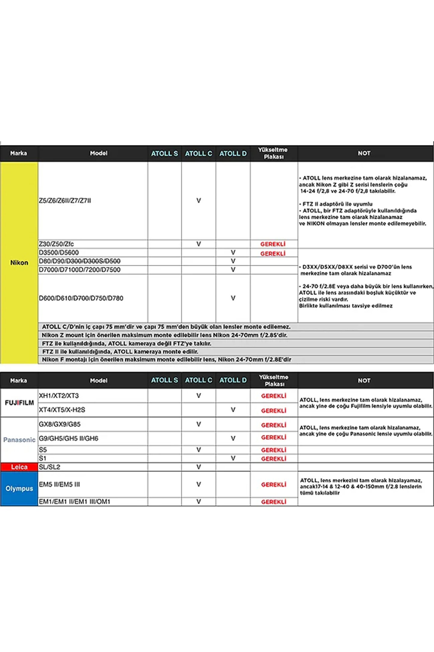 Canon, Fujifilm, Leica, Nikon, Olympus/OM, Sony ve Panasonic'in DSLR ve Aynasız fotoğraf makineleri dahil birçok fotoğraf makinesi ve lensle uyumludur. Ek Uzatma ve Yükseltme plakaları ayrı olarak mevcuttur ve daha küçük veya farklı şekilli kamera gövdelerine doğru şekilde oturmasına yardımcı olur.