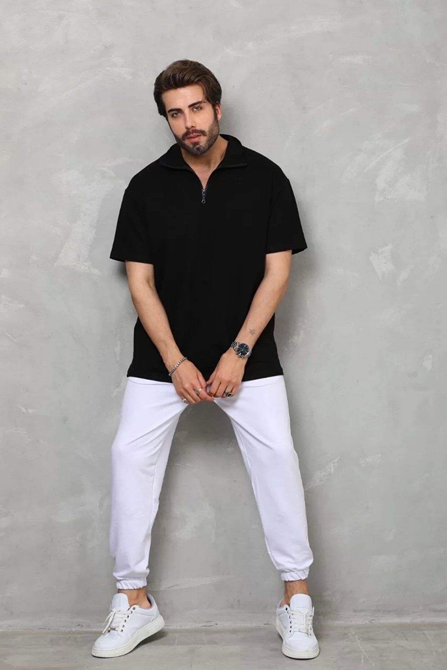 ATREAS Unisex Yarım Fermuarlı Düz Oversize T-shirt - Siyah