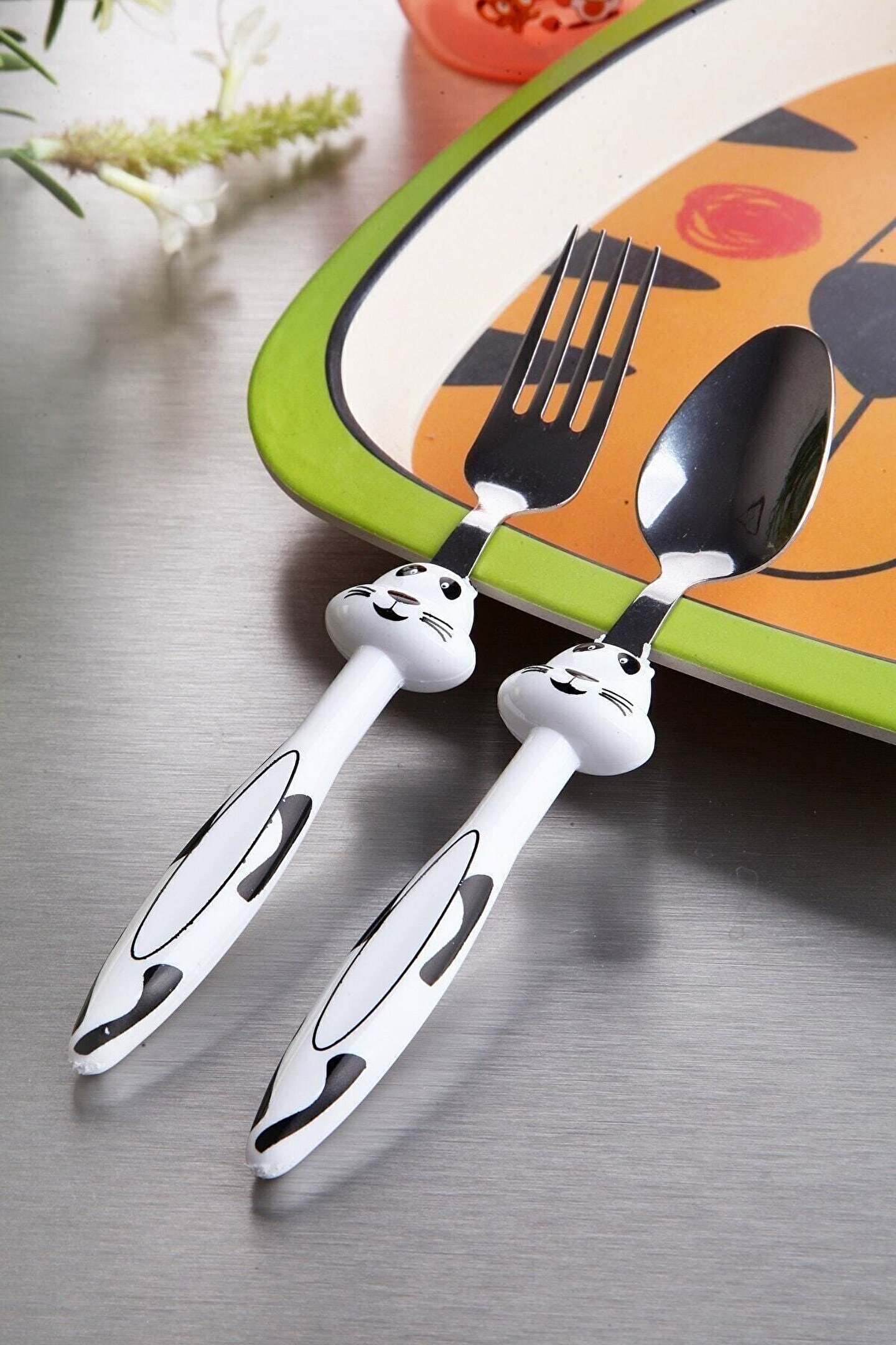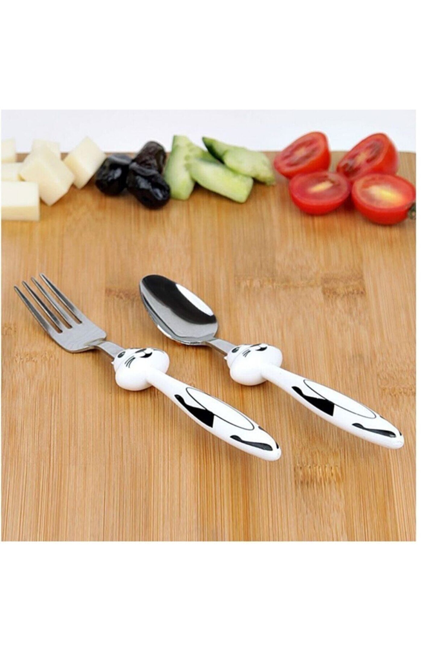 augavm Unisex Çocuk Beyaz Figürlü Lüks Çelik Mama Çatal Kaşık Seti