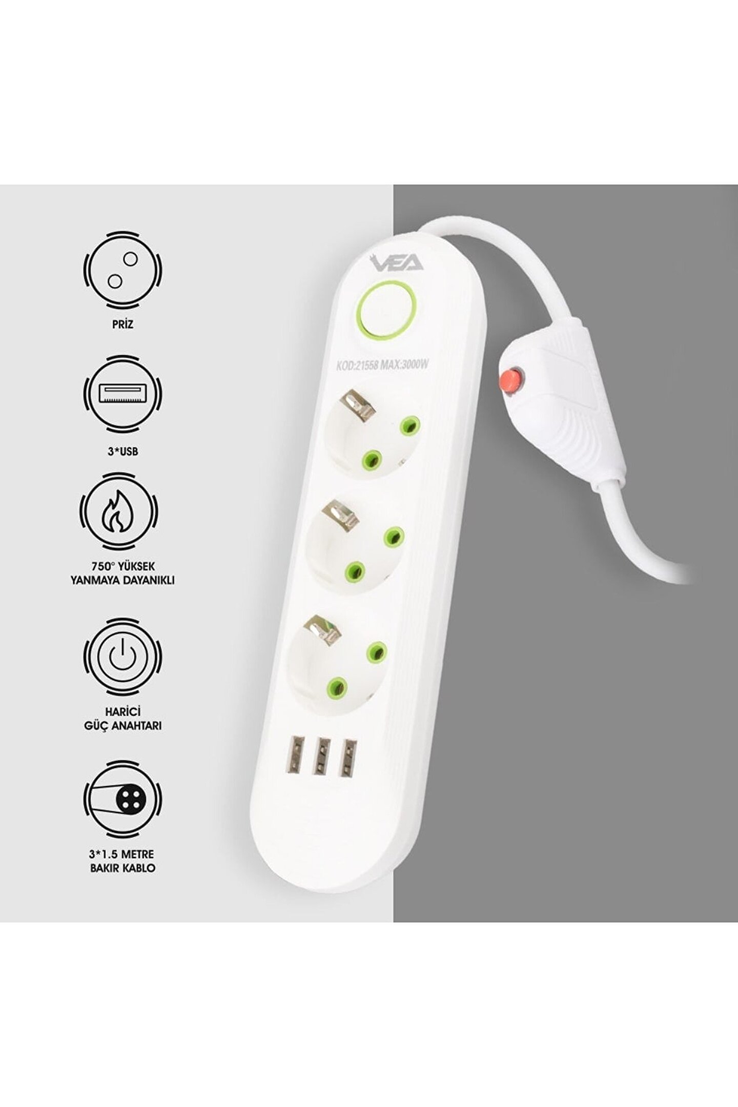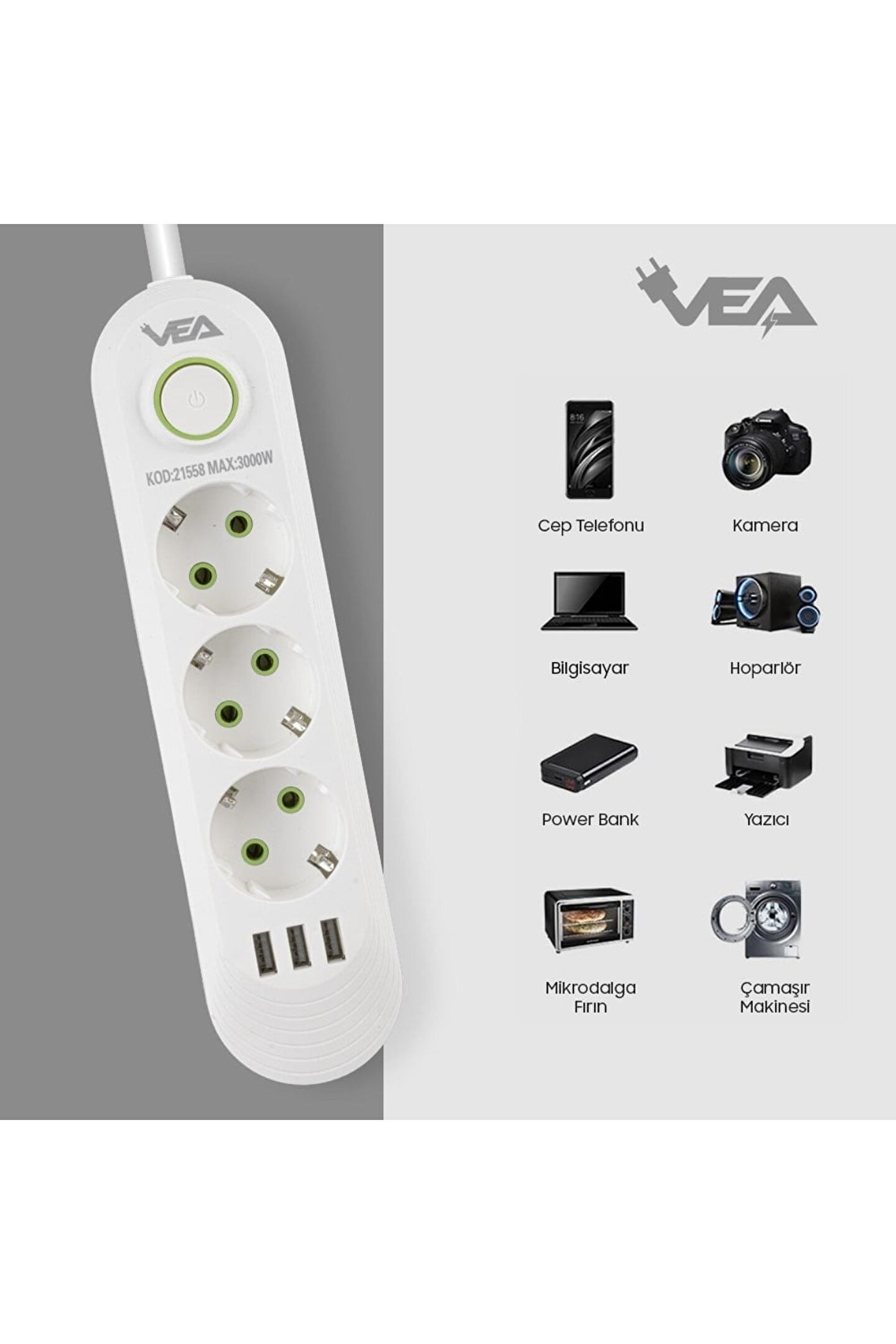 Akım Korumalı 21562 Priz Özellikleri; , Ev Ve Ofislerde Enerji Yönetimini Kolaylaştırmak Için Tasarlanmış Yenilikçi Bir Akım Korumalı Prizdir. Beyaz Renkteki Şık Tasarımıyla Odanıza Zarif Bir Görünüm Kazandırırken, 1.5 Metrelik Kablo Uzunluğu Ile Esnek Kullanım Imkanı Sunar. Ürün Detayları: 5 Priz Ve 3 Usb Çıkışı: Vea Va-21562, Beş Adet Priz Ve Üç Adet Usb Çıkışı Ile Donatılmıştır, Böylece Çok Sayıda Elektronik Cihazı Anda Şarj Edebilir Veya Kullanabilirsiniz. Prizler, Geniş Aralıklı Tasarımı Sayesinde Farklı Priz Tiplerine Uyum Sağlar. Akım Koruması: Güç Dalgalanmaları Ve Ani Elektrik Yüklemeleri, Cihazlarınıza Zarar Verebilir. , Akım Korumalı Özelliği Ile Bağlı Cihazlarınızı Bu Tür Risklere Karşı Korur, Böylece Uzun Ömürlü Bir Kullanım Sağlar. 1.5 Metre Kablo Uzunluğu: Esnek Ve Dayanıklı 1.5 Metre Uzunluğundaki Kablo, Prizin Yerleşimini Kolaylaştırır Ve Cihazlarınızın Uzakta Olmasına Rağmen Erişilebilir Olmalarını Sağlar. Güç Anahtarı: Priz Üzerinde Bulunan Açma/kapama Düğmesi, Enerji Akışını Kolayca Kontrol Eenizi Sağlar. Bu Özellik, Enerji Tasarrufu Yapmanıza Ve Gereksiz Enerji Tüketimini Önlemenize Yardımcı Olur. Kablo Üzerinde Güç Anahtarı: Her Bir Cihazı Bağımsız Olarak Kontrol Ee Imkanı Sunan Kablo Üzerindeki Güç Anahtarı, Enerji Yönetimini Kişiselleştirmenize Olanak Tanır. Ile Evinizde Veya Ofisinizde Elektrikle Ilgili Ihtiyaçlarınızı Güvenle Karşılayabilir, Cihazlarınızı Koruyabilir Ve Enerji Tasarrufu Yapabilirsiniz. Sağlam Tasarımı Ve Kullanıcı Dostu Özellikleri Ile Vea, Elektrikli Cihazlarınızın Güvenliğini Ve Performansını Sağlamak Için Ideal Bir Tercihtir. Ürünlerimiz İsminde Belirtilmediği Sürece 1 Adet Gönderilmektedir.renk Ve Modeller İçin Mesaj Atınız!!! Ürün İsmine Ve Ürün Açıklamasında Belirtilen Özelliklere Lütfen Dikkat Ediniz.!!! Akdenizpos Markasının Ürün İsminde Yada Marka İsminde Yetkisiz Kullanmak Yasaktır. ;