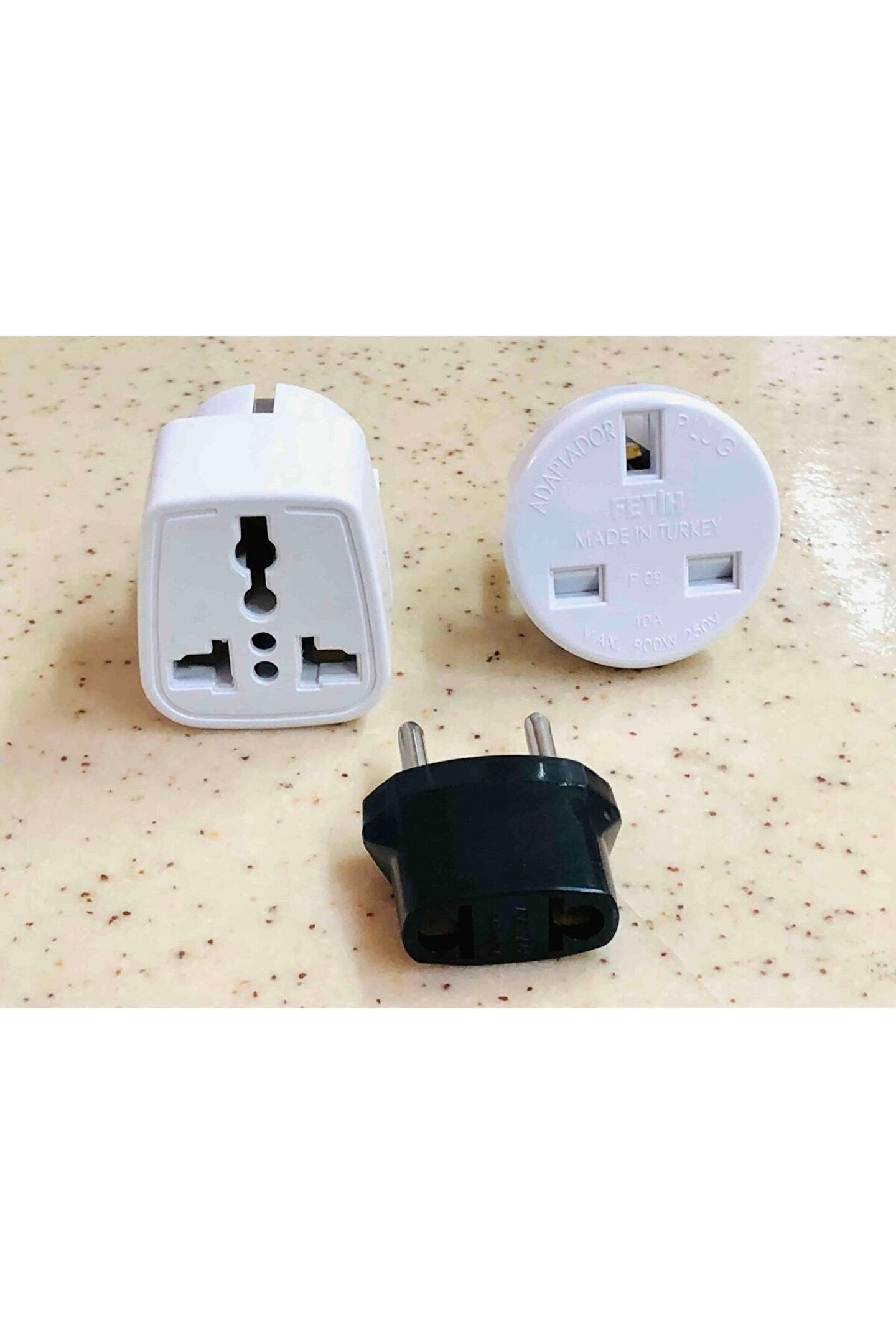 3 adet birbirinden farklı abs plastik çevirici elektrik fiş ucu ; 1. Ingiliz ucunu türk prizine çeviren beyaz renkli yuvarlak topraklı dönüştürücü ; 2. Amerikan + ingiliz ucunu türk prizine çeviren beyaz renkli kare tipi dönüştürücü ; 3. Amerikan 2 pinli duz elektrik ucunu türk prizine dönüştüren küçük siyah renk çevirici ; Yurtdışındaki prizlere uygun ürünleri çalıştırma konusundaki problemi çözmek için kullanılır ; 3 adet resimde görülen çeviriciler gönderilecektir ;