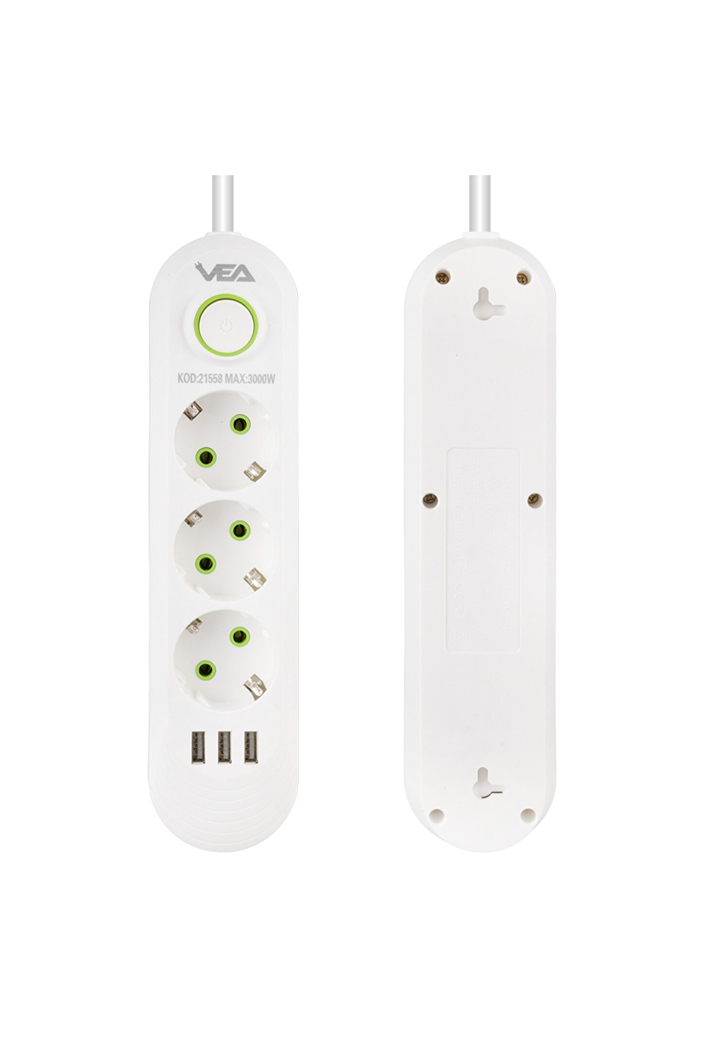 • 3 Priz ve 3 USB Çıkışı:  Vea VA-21558, üç adet priz ve üç adet USB çıkışı ile donatılmıştır, böylece çok sayıda elektronik cihazı aynı anda şarj edebilir veya kullanabilirsiniz. Prizler, geniş aralıklı tasarımı sayesinde farklı priz tiplerine uyum sağlar.