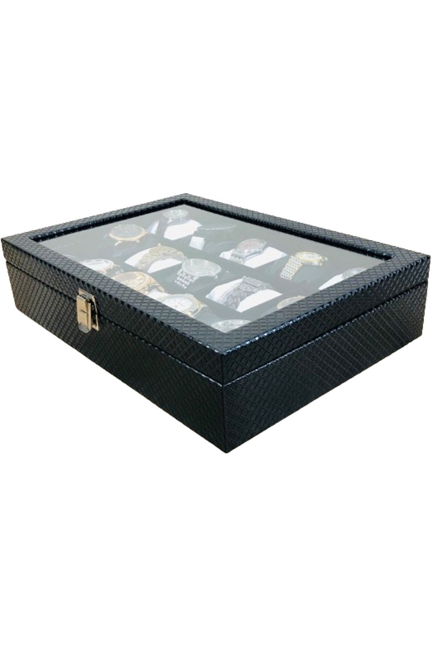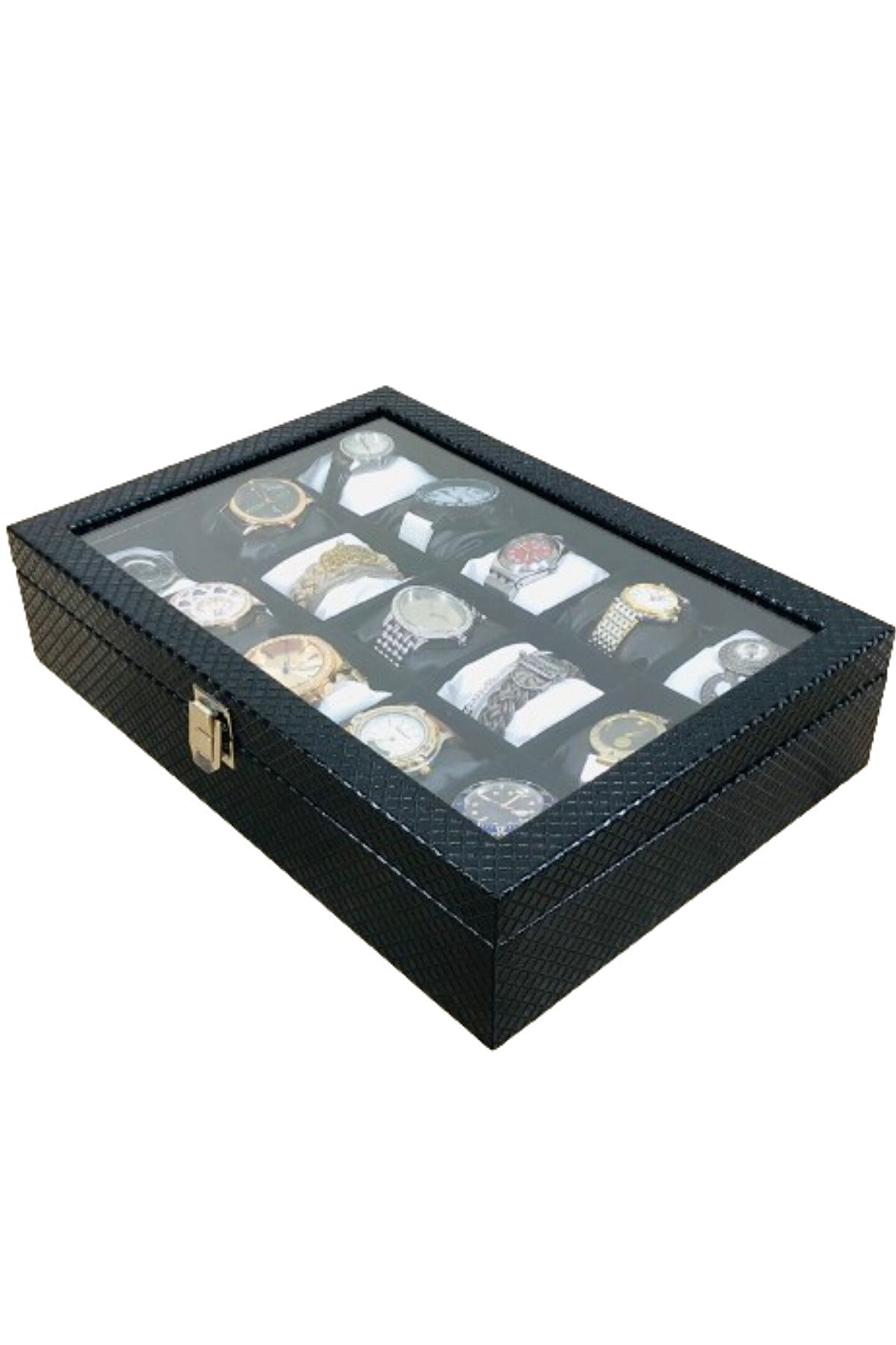Axe Tools Baklava Desen Siyah Renk Deri Kaplama Ahşap Lux 15li Saat Kutusu Siyah Beyaz Yastıklı