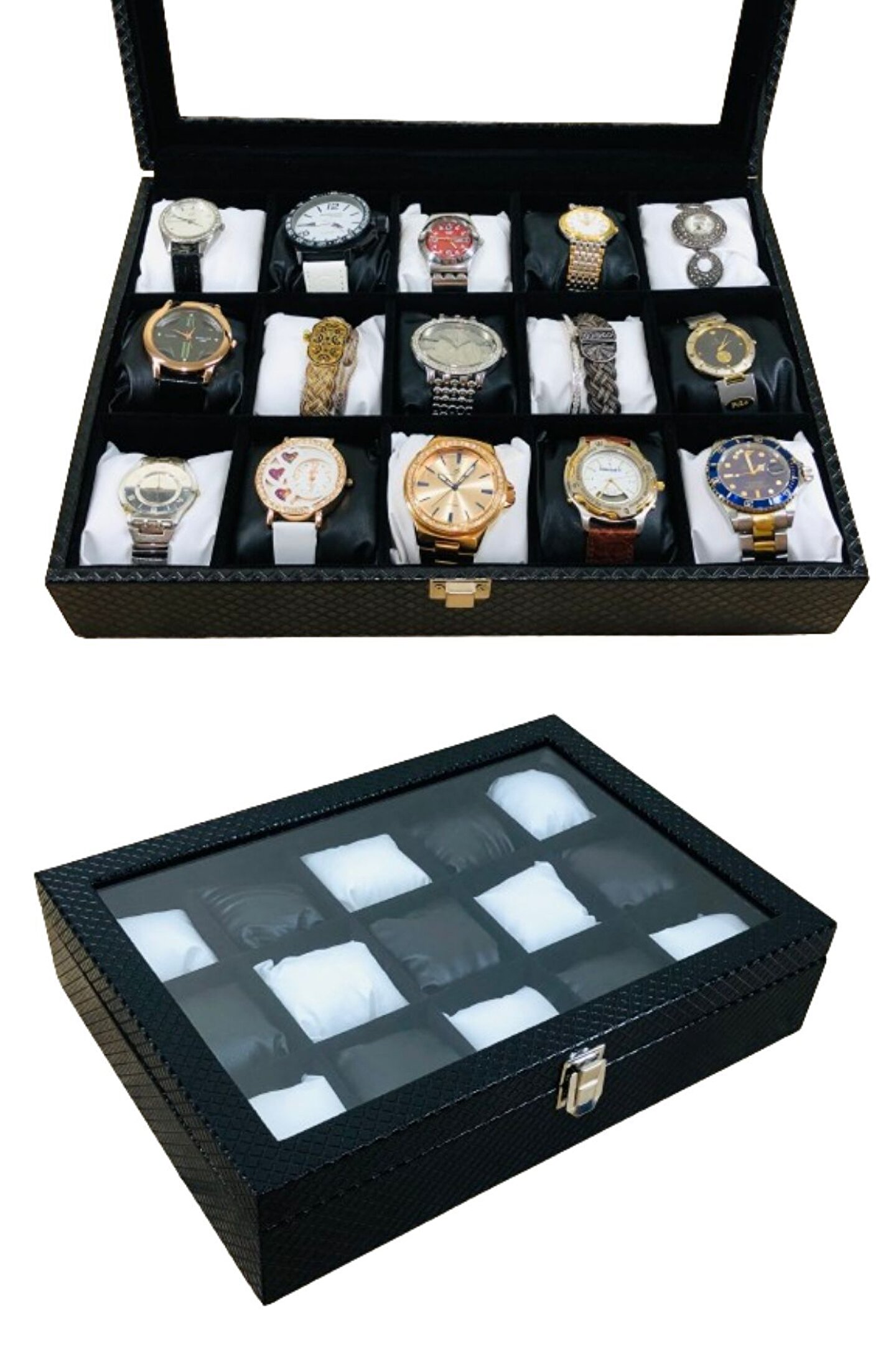 Baklava Desen Siyah Renk Deri Kaplama Ahşap Lux 15'li Saat Kutusu Siyah Beyaz Yastıklı