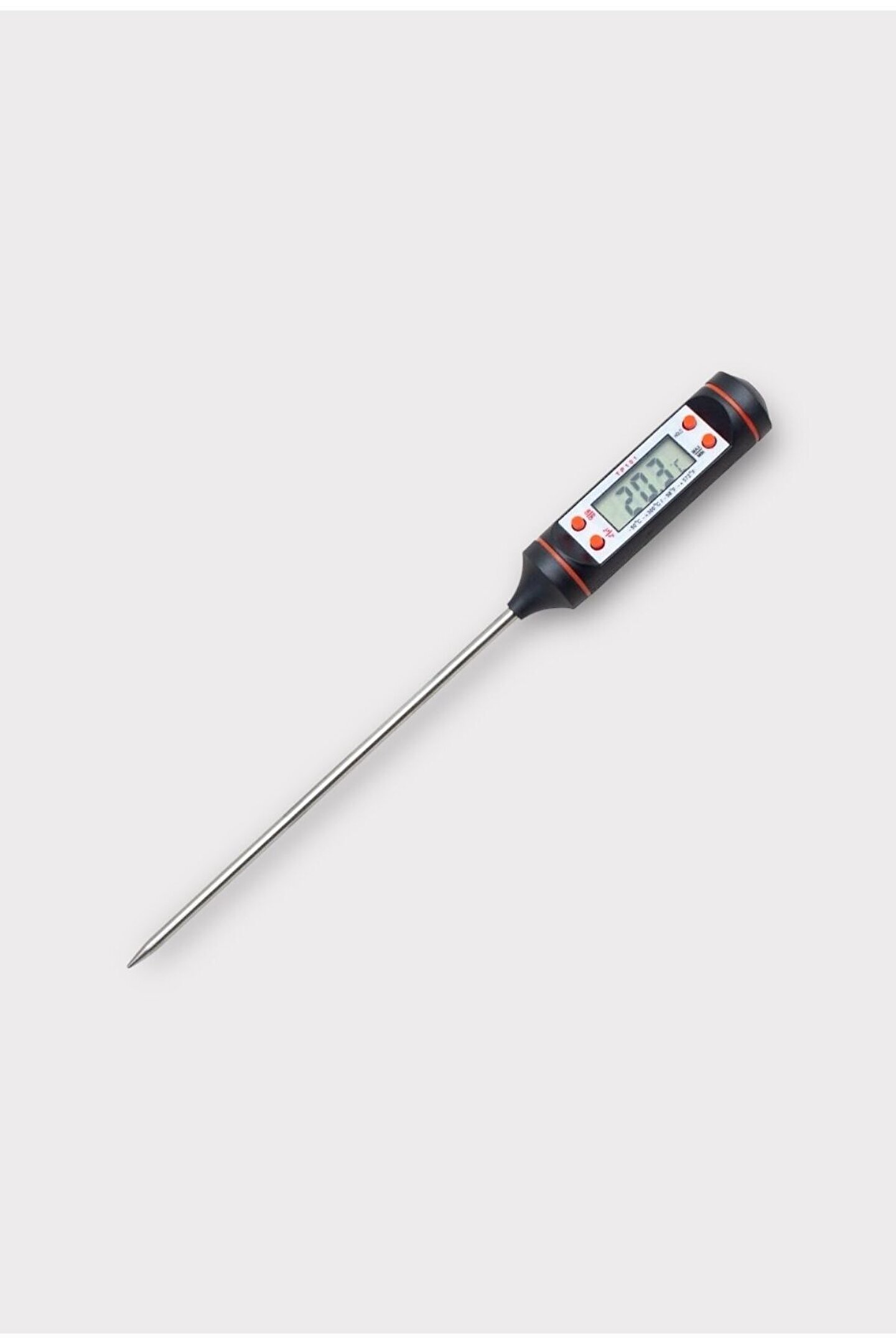 Cep tipi daldırmalı dijital termometre, geniş ölçüm aralığı ve hızlı tepki süresi ile mutfakta, laboratuvarda veya endüstriyel alanlarda güvenle kullanılabilir.; -50°C ile 300°C arasında sıcaklık ölçümü yapabilen cihaz, sadece 1 saniyede sonucu ekrana yansıtır.; °C ve °F ölçüm desteği sayesinde farklı kullanım ihtiyaçlarını karşılar.; Enerji tasarrufu için 10 dakika işlem yapılmadığında otomatik kapanma özelliğine sahiptir.; Kompakt yapısı ve paslanmaz çelik probu ile dayanıklı ve uzun ömürlüdür.; ⸻ ⚙️ Ürün Özellikleri: • Ölçüm Aralığı: -50°C ~ +300°C • Çözünürlük: 0.1°C • Doğruluk: ±1°C • Ölçüm Modu: °C ve °F • Ölçüm Hızı: 1 saniye • Sezici Tipi: K • Kalibrasyon: 0°C referans sıcaklık ile kendi kendini kalibre edebilir • Ekran: Dijital LCD ekran • Ekstra Özellik: Düşük pil uyarısı • Otomatik Kapanma: 10 dakika kullanılmadığında • Güç Kaynağı: 1 adet LR44 pil • Boyut: 260 x 20 x 15 mm • Kullanım Alanları: Mutfak, yiyecek kontrolü, içecekler, sıvılar, laboratuvar ve endüstriyel ölçümler