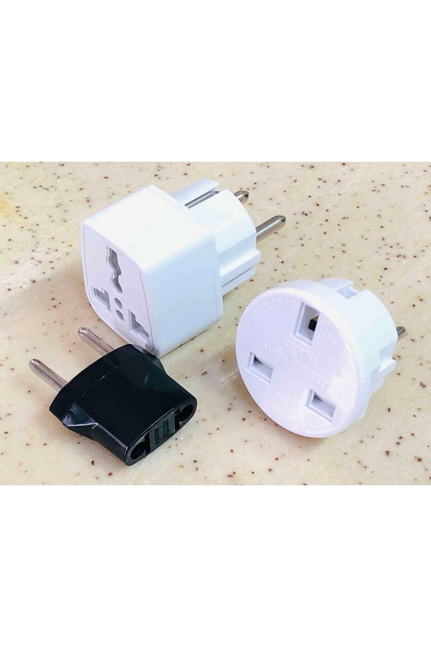 3 adet birbirinden farklı abs plastik çevirici elektrik fiş ucu ; 1. Ingiliz ucunu türk prizine çeviren beyaz renkli yuvarlak topraklı dönüştürücü ; 2. Amerikan + ingiliz ucunu türk prizine çeviren beyaz renkli kare tipi dönüştürücü ; 3. Amerikan 2 pinli duz elektrik ucunu türk prizine dönüştüren küçük siyah renk çevirici ; Yurtdışındaki prizlere uygun ürünleri çalıştırma konusundaki problemi çözmek için kullanılır ; 3 adet resimde görülen çeviriciler gönderilecektir ;