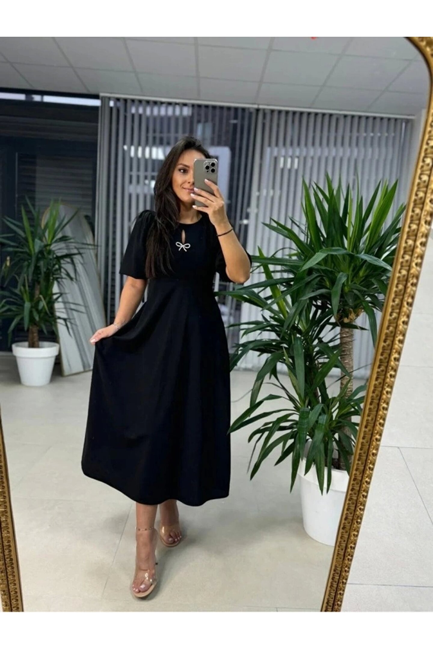 Aydoganticaret44 Kadın Kısa Kollu Bisiklet Yaka Fiyonk Broşlu Midi Janjan Krep Elbise