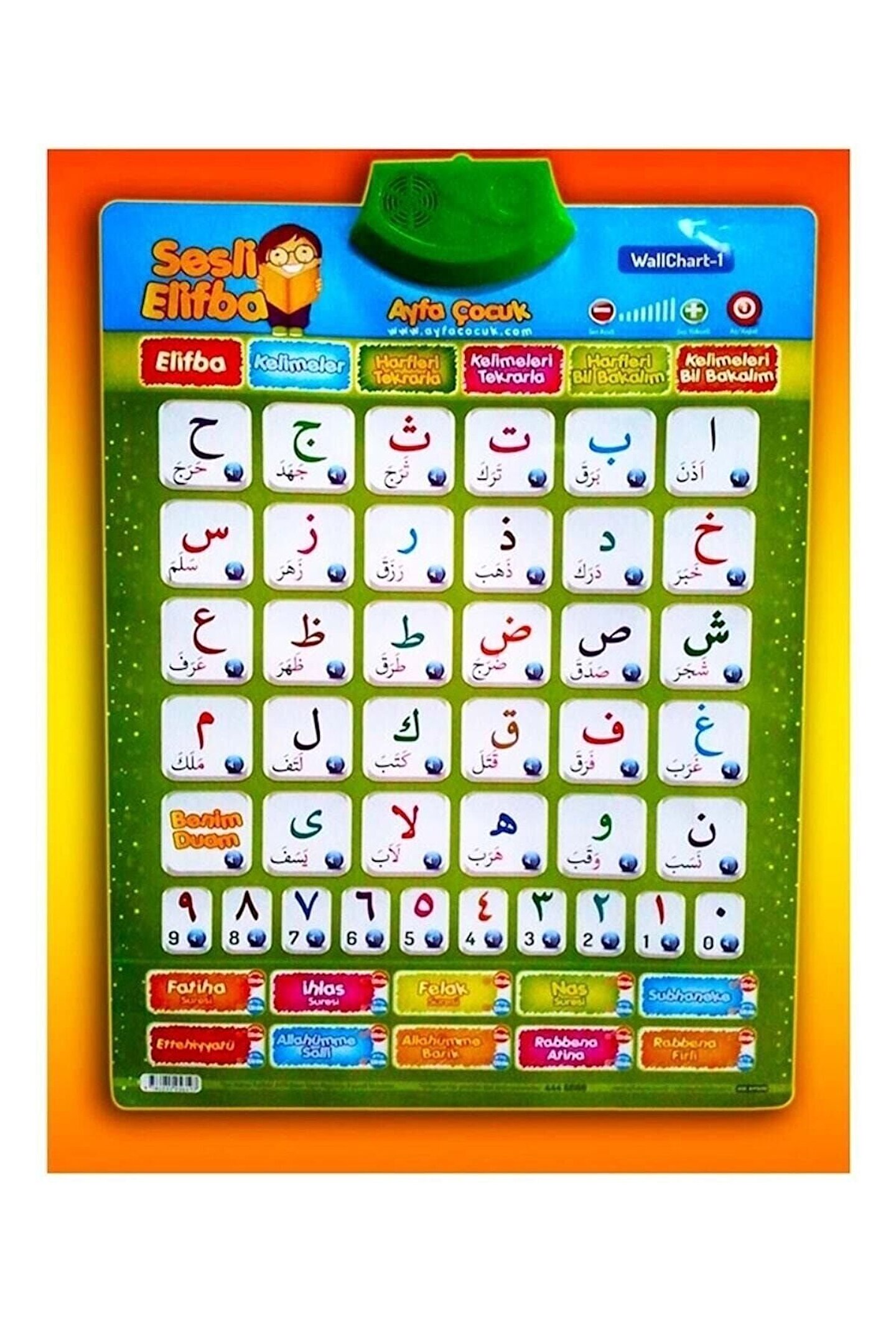 ÜRÜN AÇIKLAMASI Ürün Ebatları: 41.5 cm * 30.5 cm Çocuklarınıza Kur'an-ı Kerimi daha eğlenceli ve kalıcı olarak öğretebileceğiniz sesli elifbadır. ; Pillidir ve Her harfin üzerine dokunduğunuzda sesli olarak harfleri mahrecleriyle birlikte okumaktadır. ; Harflerin oluşturduğu kelimeleri de sesli olarak dinleyebilirsiniz. ; Harfleri ve kelimeleri tekrarlatarak daha kalıcı bir öğrenme sağlayabilirsiniz. ; Aynı zamanda Arapça rakamları da Türkçe rakamlarla karşılaştırmalı öğretebilirsiniz. ; Harfleri Bil Bakalım oyunu oynayabilirsiniz. ; Kelimeleri Bil Bakalım oyunu oynayabilirsiniz. ; Dilediğiniz her ortama yanınızda götürebilirsiniz. ; Çocuklarınız bu güzel sesli elifba ile Kur'an-ı Kerimi, kısa sureleri ve duaları kimseye ihtiyaç duymadan eğlenceli bir şekilde öğrenecek. ;