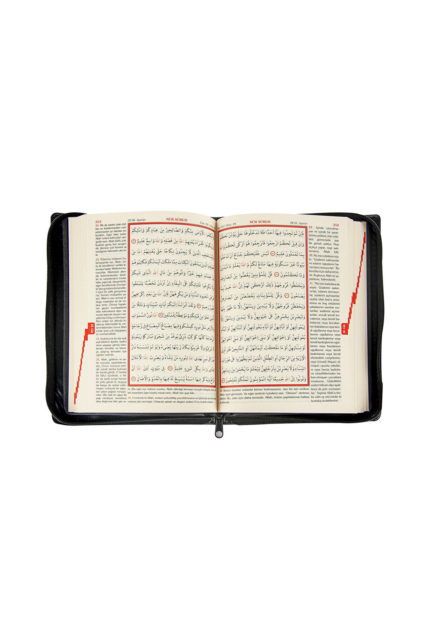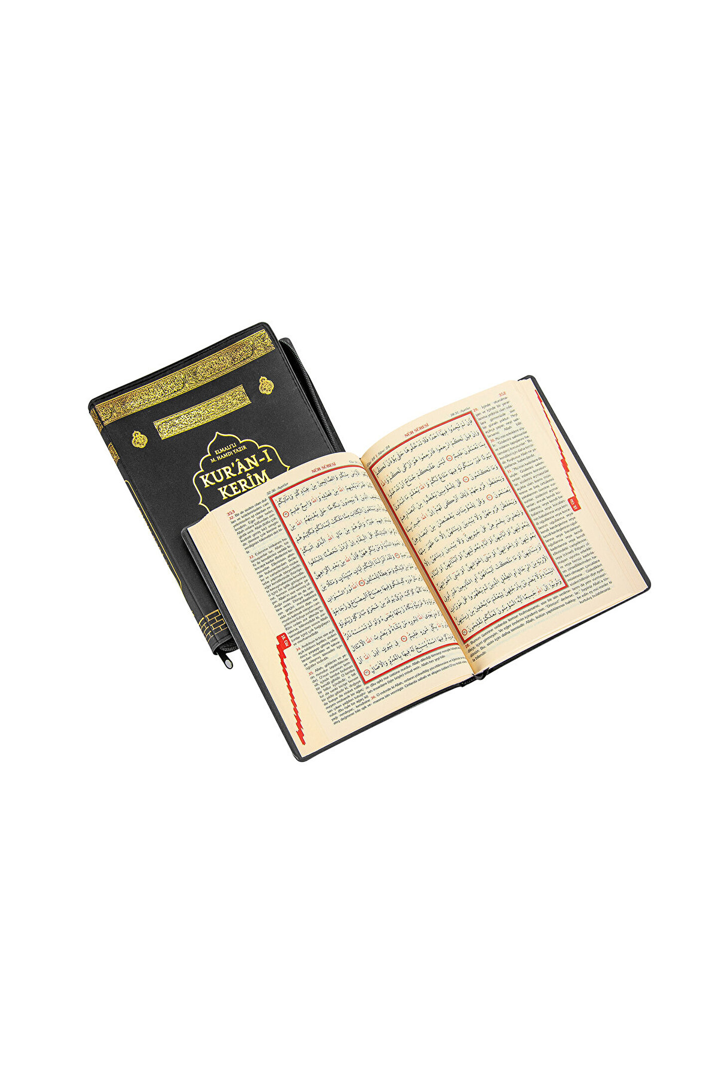 Kabeli Çanta Boy Fermuarlı Mealli Kuranı Kerim Ürün Özellikleri : Ürün Kodu 063 Kabe; Bilgisayar Hatlı Milyonlarca insanın Kur'ân-ı Kerim okumasını öğrendiği hattan.; Okuması çok kolay bilgisayar hatlı.; Diyanet Mühürlü Diyanet İşleri Başkanlığı Mushafları İnceleme ve Kıraat Kurulu'ndan Onaylı ve Mühürlü.; QR Kod Teknolojisi Yok; Renk Siyah; Ağırlık 0,4 gram; Baskı Rengi 2 Renk; Boy Çanta Boy (12 cm * 16 cm); Kapak Deri (Fermuar Cilt); İç Kağıt Şamua Kağıt; Sayfa 616 Sayfa; Mealli; Not : Bu Kur'ân-ı Kerim Hafız Osman Hattına sâdık kalınarak Sayfa Tutar, Berkenar, Secavendli, Med'li ve Kasır'lı olarak hazırlanmıştır Özel Suni Deri Fermuarlı Çanta