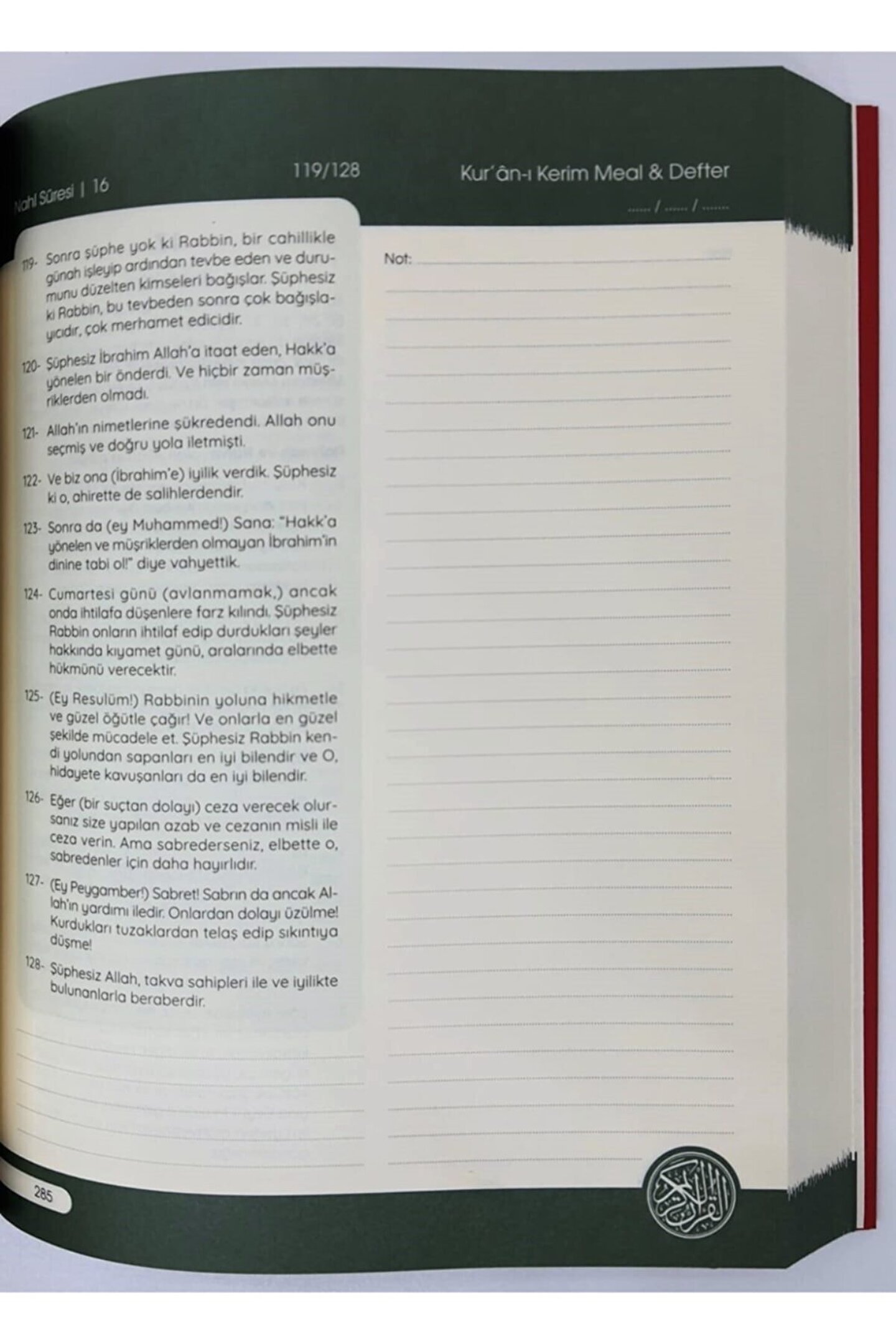Meal / Defter ’ini, Osmanlı ulemasının en önemli şahsiyetlerinden, ömrünü İslam dinine adamış Elmalılı Muhammed Hamdi Yazır'ın sadeleştirilmiş mealinden hazırladık. Sayfa içerisinde not alanı bulunmaktadır. Bu alana, siz kendi notlarınızı yazabilir, istediğiniz yerlerin altlarını çizebilirsiniz. Bu sizin hem kolay çalışmanızı hem de günlük hayatta sorduğunuz soruların cevaplarını kolayca bulmanızı ve Kur'an'ın ışığı ile aydınlanmanızı sağlayacaktır. Unutmayın ki okumak ve düşünmek mümin'e bir emirdir. “İşte Rabbinin doğru yolu budur. Şüphesiz biz düşünüp ibret alan bir kavim için ayetleri geniş bir şekilde açıkladık.” (En’am suresi 126. Ayet) Meal/Defter’i evde, yolculukta, işte… her yerde yanınızdan ayırmayacağınız kılavuz bir yol arkadaşı olacaktır. Belki de alacağınız notlarla; düşünceleriniz, araştırmalarınız ileride çocuklarınıza, torunlarınıza rehberlik etmenizi sağlayacaktır. “Gerçekten onlara, bilgiye göre açıkladığımız, inanan bir toplum için yol gösterici ve rahmet olan bir kitap getirdik.” (A’rafsuresi,52.ayet)