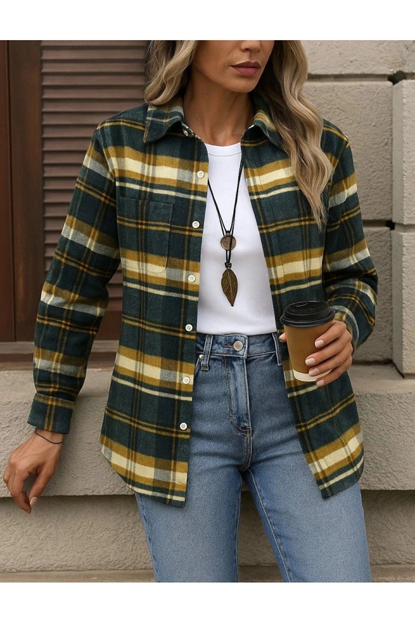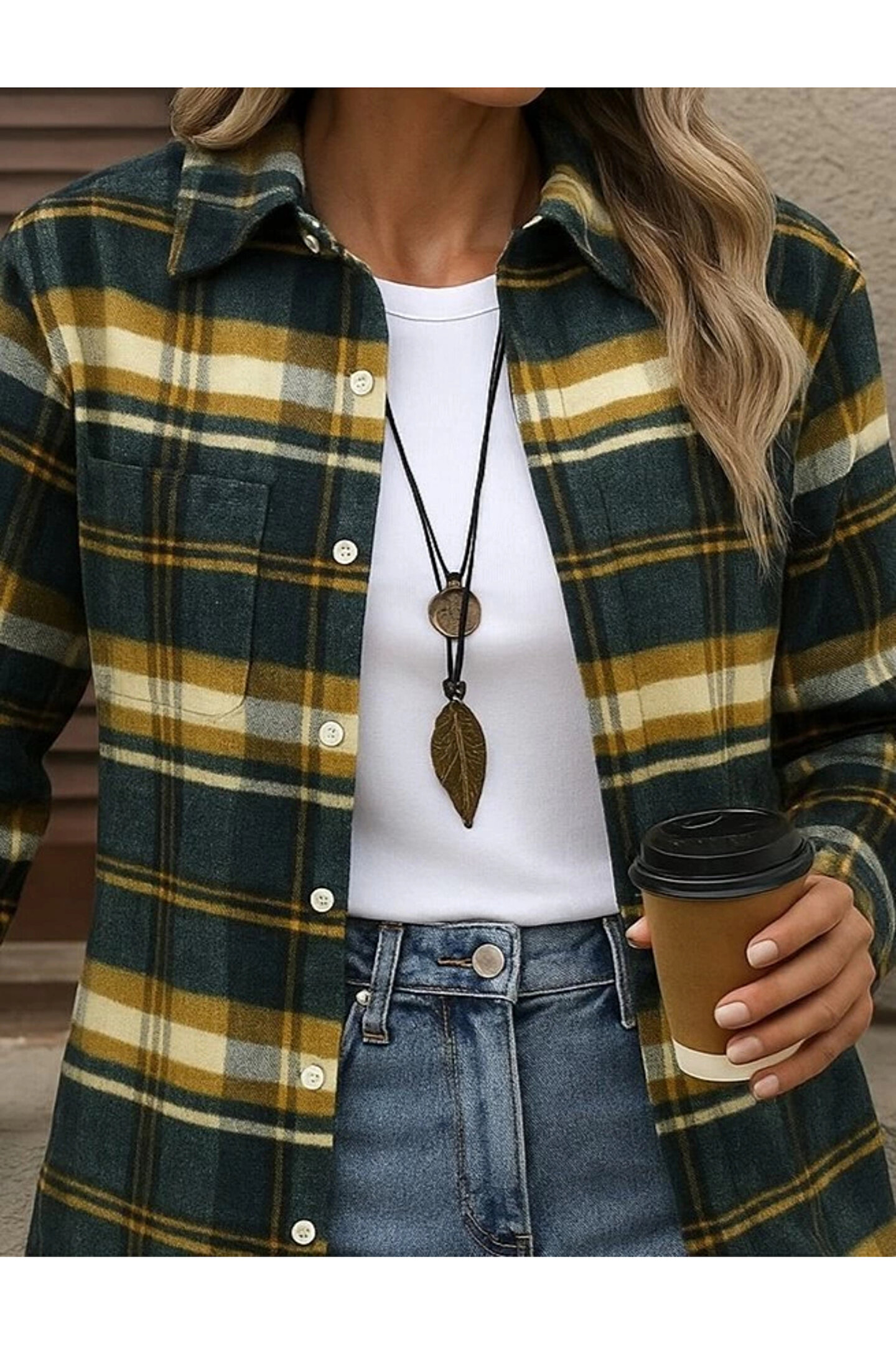 babatr.com Kadın Uzun Kollu Kare Desenli önden Düğmeli Dokuma Gömlek