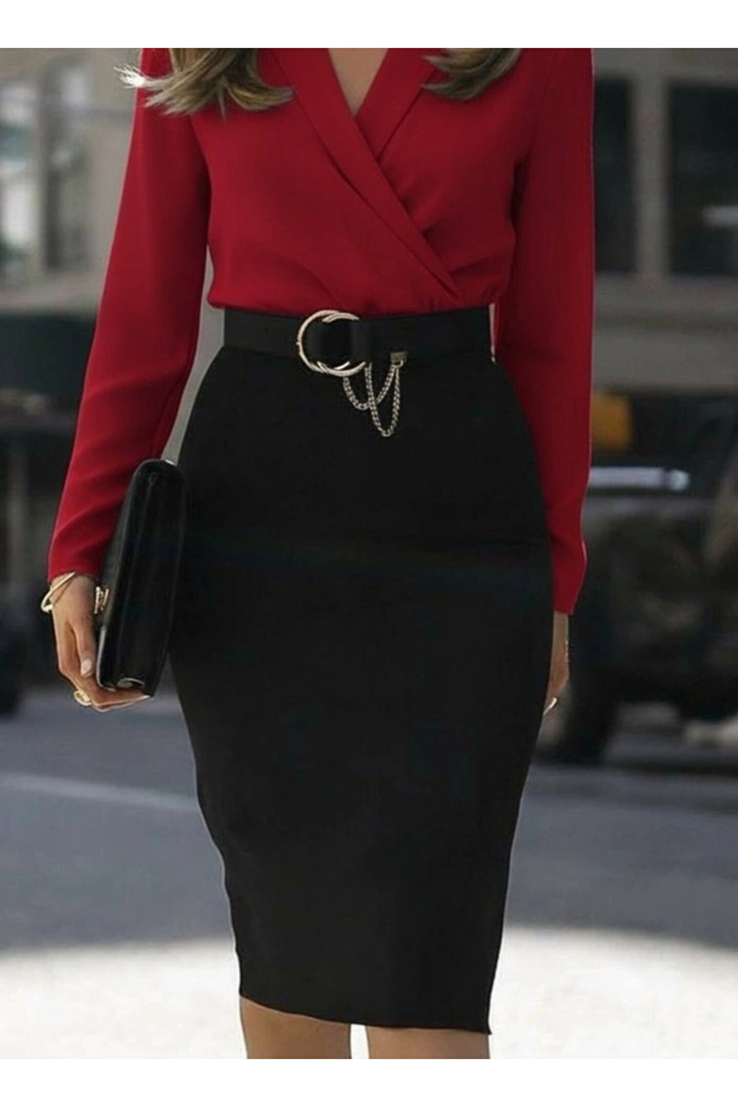 babatr.com Kadın Uzun Kollu Kruvaze Yaka Janjan Krep Midi Elbise