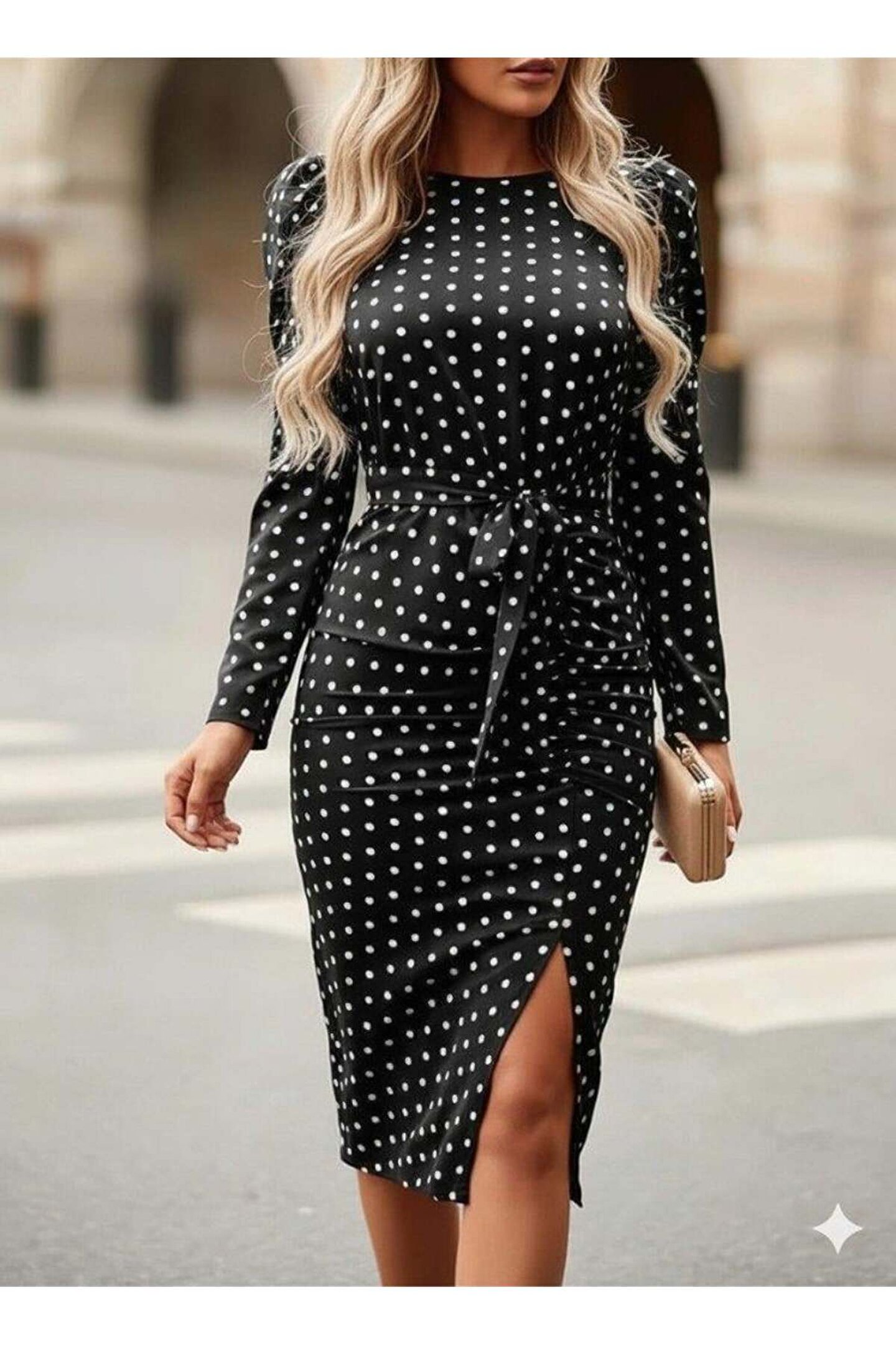 babatr.com Kadın Uzun Kollu Yuvarlak Yaka Belden Kuşaklı önden Yırtmaçlı örme Krep Elbise
